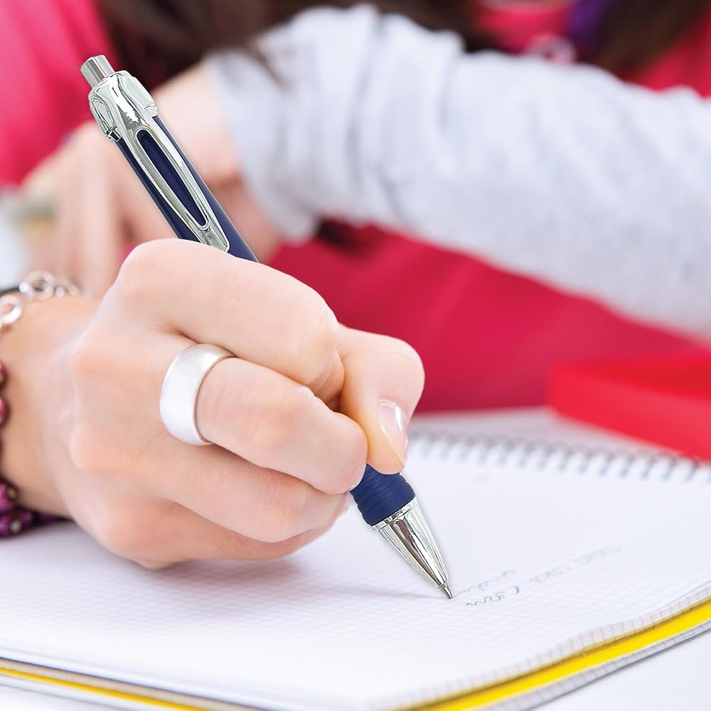 Wide barrel with soft contoured rubber grip provides outstanding comfort and control. Acid-free, archival quality ink ensures a long life for your documents. Silver-coated cone, ring clip and plunger for added style. Retractable pen protects pockets and purses.