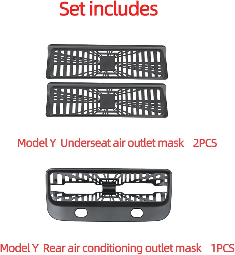 This rear seat ventilation cover for Tesla Model Y is made of high-quality ABS plastic, which is durable and wear-resistant. It has a unique grid pattern design that matches the original decoration of the vehicle, making it a perfect accessory for Tesla Model Y owners who want to enhance the interior appearance of their vehicle. The rear seat ventilation cover is easy to install and does not require any installation tools. It only needs to be fixed with a buckle, which is not easy to fall off. The air outlet grille guard is made of high-quality ABS plastic, which is wear-resistant, scratch resistant, and not easily broken or bent.