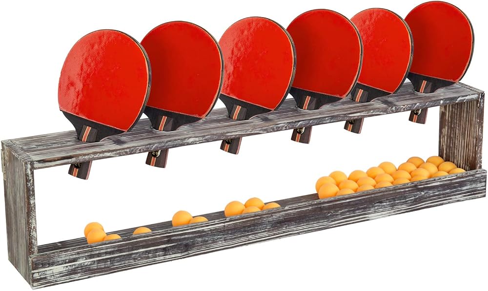 Keep your ping pong paddles and balls organized with this rustic wood wall mounted display rack with ball storage shelf. Up to 6 ping pong paddles can be stored on top, with storage space for balls located on the bottom shelf. Featuring a stylish rustic wood construction, and able to be mounted to most wall surfaces, this display rack will look great in your game room, garage, man cave or bar area.
