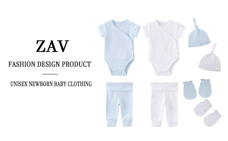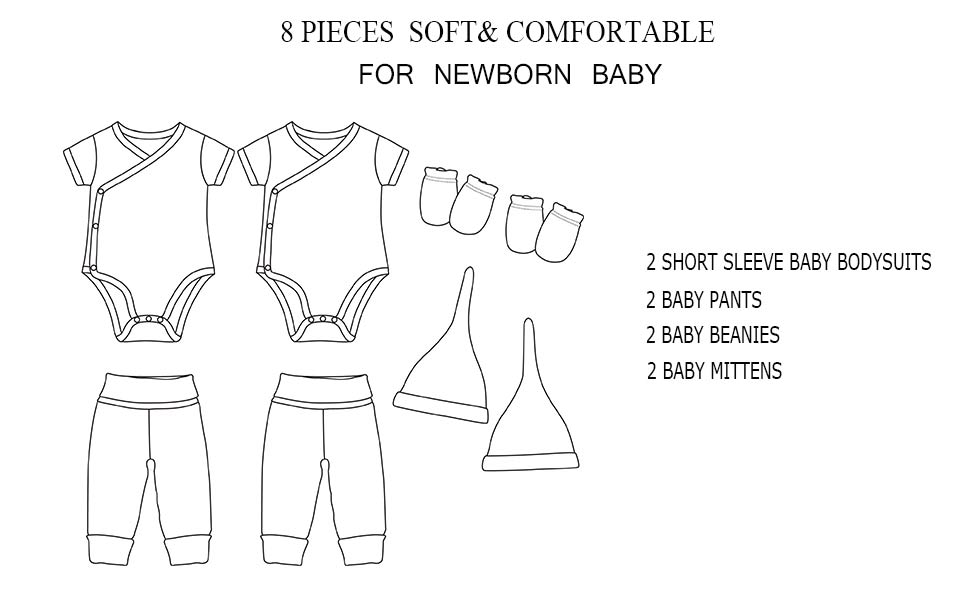 8 Must have accessories :This solid colors unisex gift set has the clothes and accessories you need for a newborn baby.It includes 2 short sleeved bodysuits, 2 pants, 2 hats, 2 pairs of scratch prevention mittens.