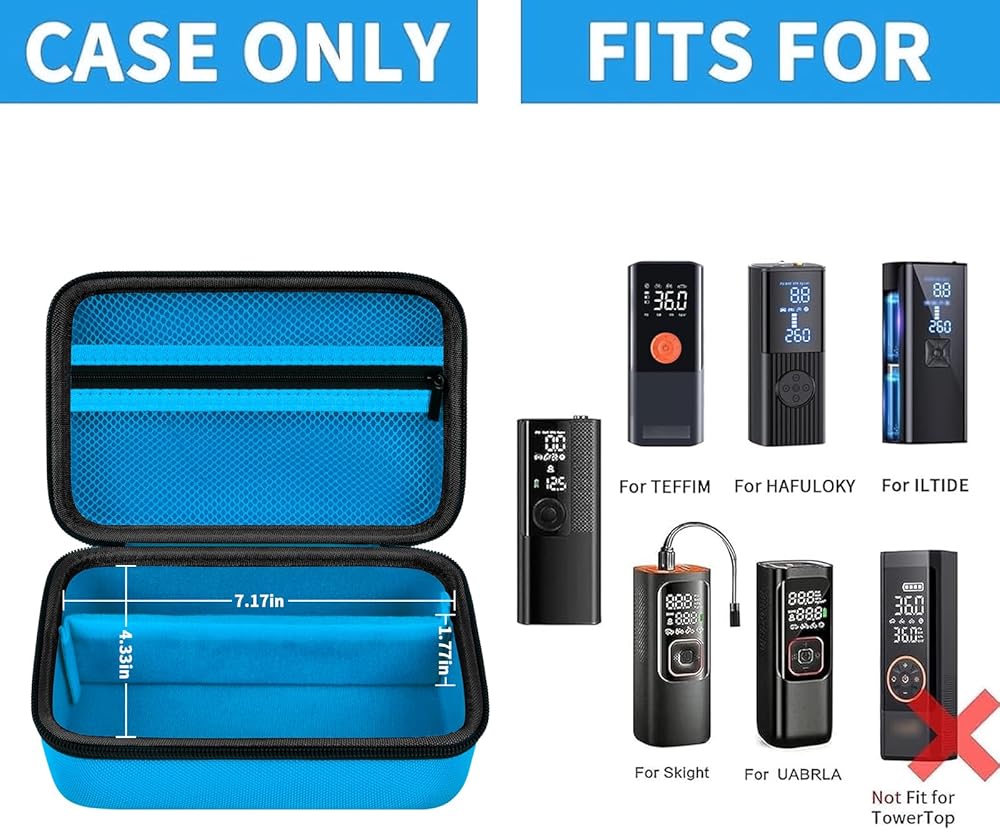 Wide Compatibility for Car Tire Pump Case: Portable tire inflator cover is specially customized for Skight 160PSI & 2X Faster Tire Inflator, which keeps for Skight air pump in good condition. With a adjustable divider, car air compressor bag can fit for VacLife/ for UABRLA/ for ILTIDE/ for IILUEE/ for Acpatur Portable Air Compressor and other brand's cordless rechargeable air compressor, which size doesn't exceed 7.17 * 4.33 * 1.77 inches. Do not fit for Towertop air compressor. (Bag Only)