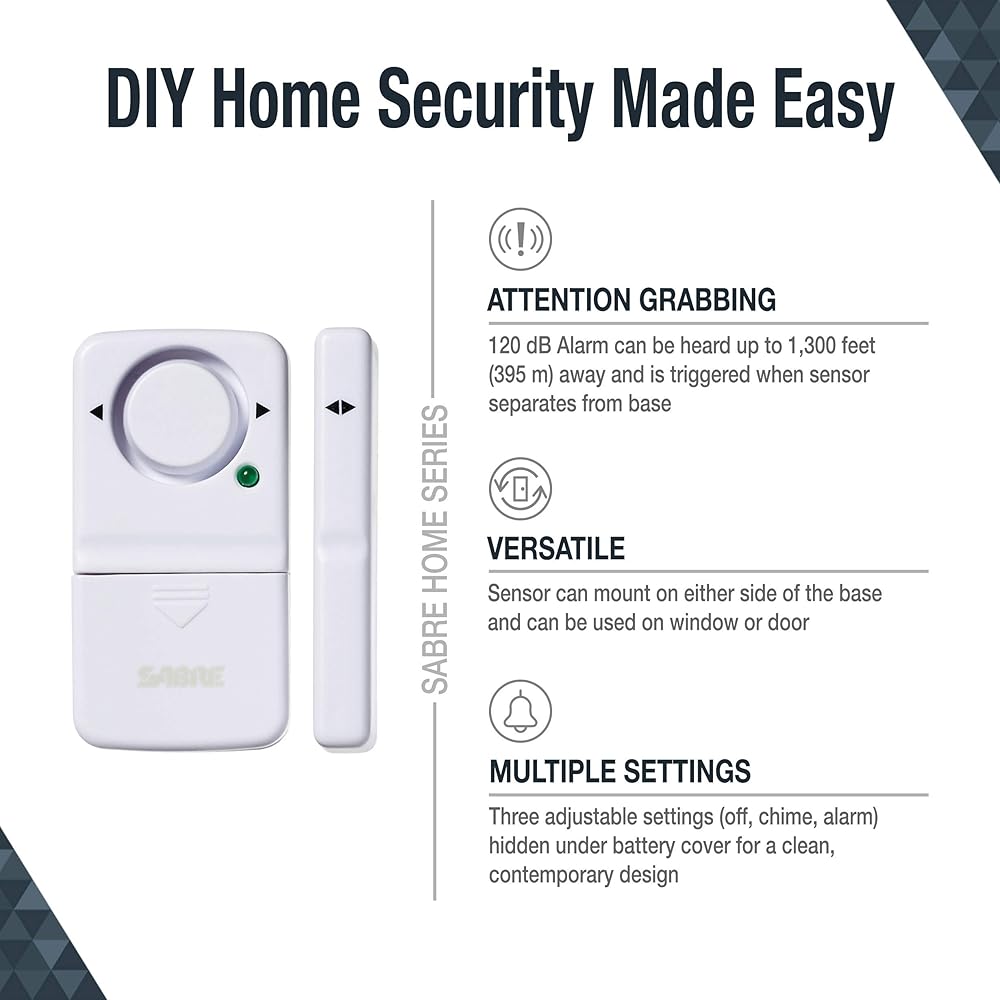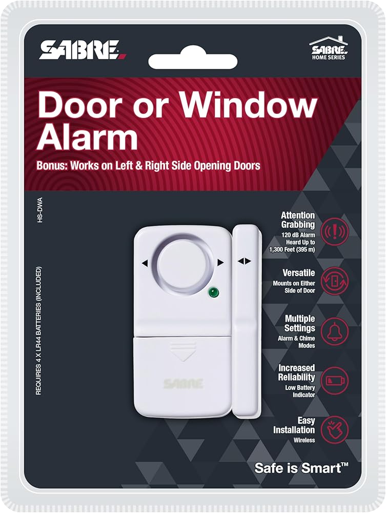 A burglary occurs every 14.5 seconds in the U.S., and budget cuts have led to an average 911 response time of 10 minutes. The attention-grabbing Door or Window Alarm is 120 dB and audible up to 1,300-feet (395-meters) away. The user-friendly home security alarm comes with three adjustable settings: off, alarm and chime, which is ideal for alerting you when children or guests come and go while you're at home. Featuring a consumer preferred premium white, this attractive alarm looks great in your home. With no wiring needed, the Door or Window Alarm works during power outages – 4xLR44 batteries are included for a greater value. Installation is a breeze, as the self-adhesive pad is included and the sensor mounts on either side of the alarm. For an added level of security, the alarm features a low battery test button. The Door or Window Alarm was developed by SABRE, the #1 pepper spray brand trusted by police and consumers worldwide, meaning this product is extremely reliable. Backed by over 45 years in the security industry, SABRE products must pass rigorous quality assurance testing before leaving our facilities to give you peace of mind. Improve your home security today.