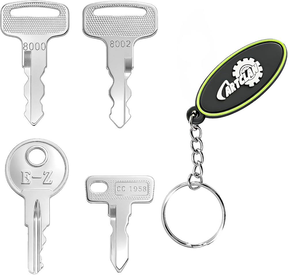 Golf Cart Key Set (4PCS) for EZGO, Yamaha, Club Car Golf Cart OEM# 1X 17063-G1 EZGO key; 1X 1012505 Club Car key; 1X JU2-H2511-00 YAMAHA key; 1X 8002 JU6-H2511-10 Yamaha key; 1X Soft PVC Keychain YSK-0004( Includes key tag with the key models listed on the back);