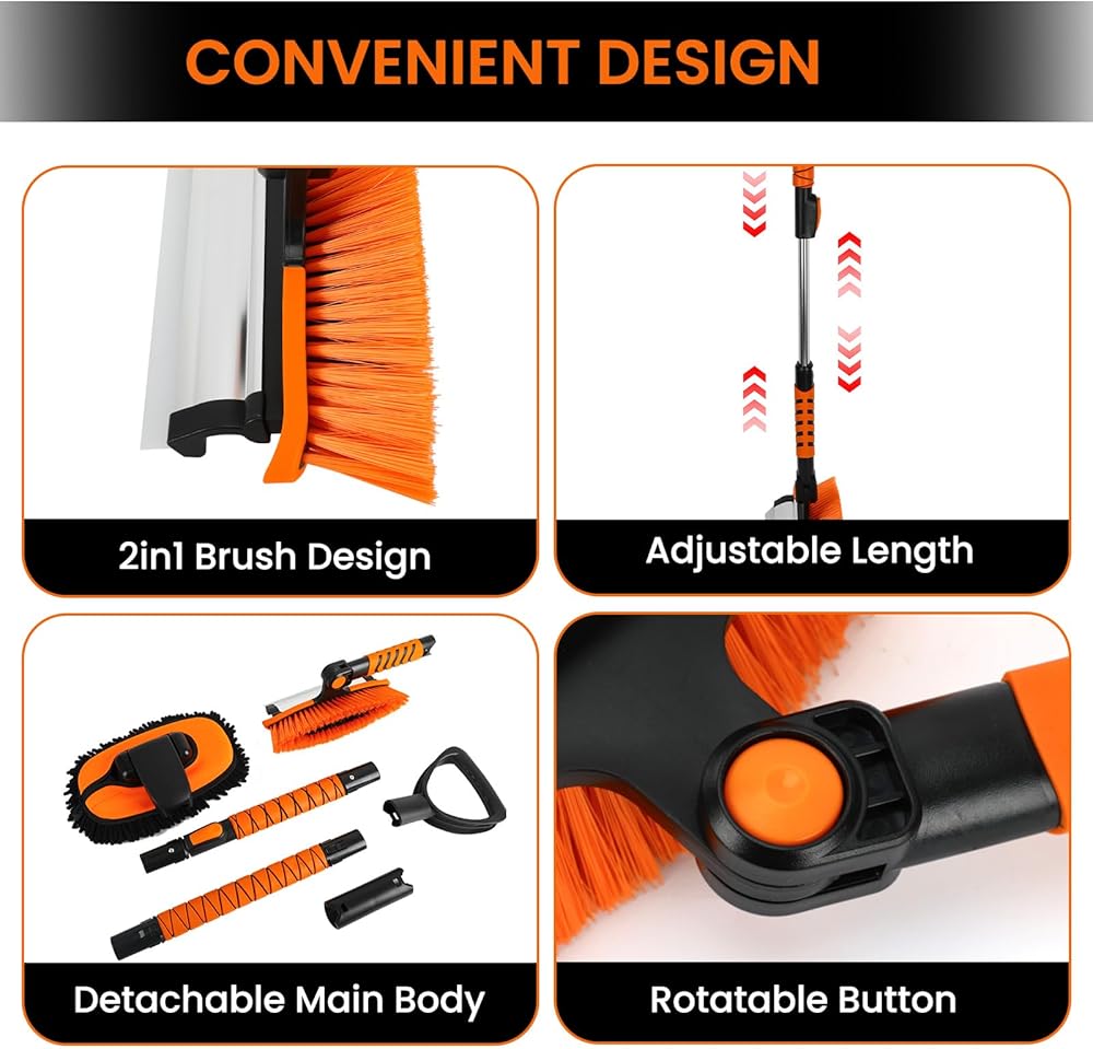 【Extendable&Detachable Design】Both snow scraper and car wash brush are Detachable. The handle extends to three positions: Smallest, middle, and longest (44”, 47”, 52”). The telescoping handle and 180° swivel head can help clean snow from the entire windshield without having to switch sides.All in all,This is a awesome scraper/brush combo for those heavy snow days.