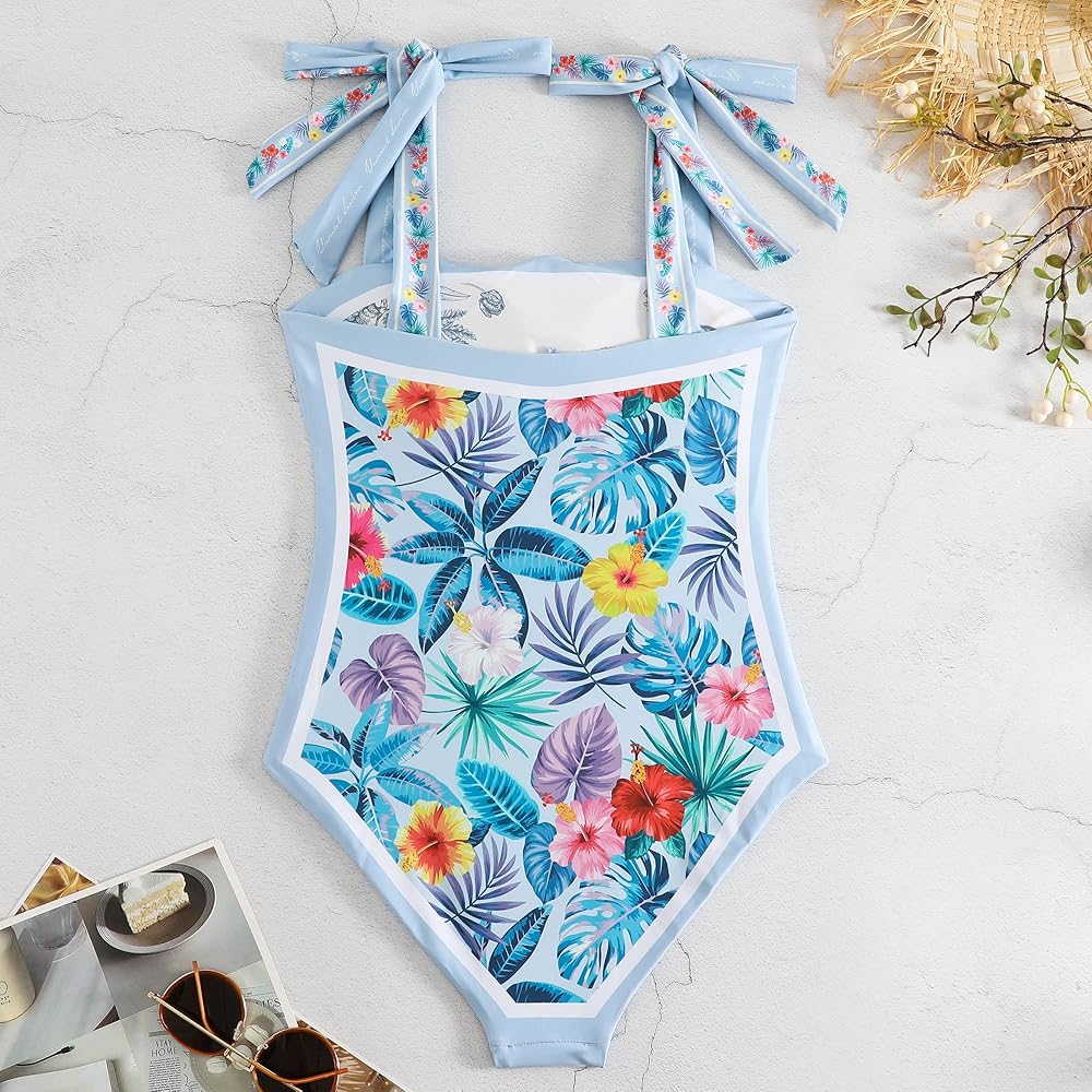 Women Floral One Piece Swimsuits, Reversible Tie Shoulder Monokini, Tummy Control Bathing Suits, Square Neck Swimwear