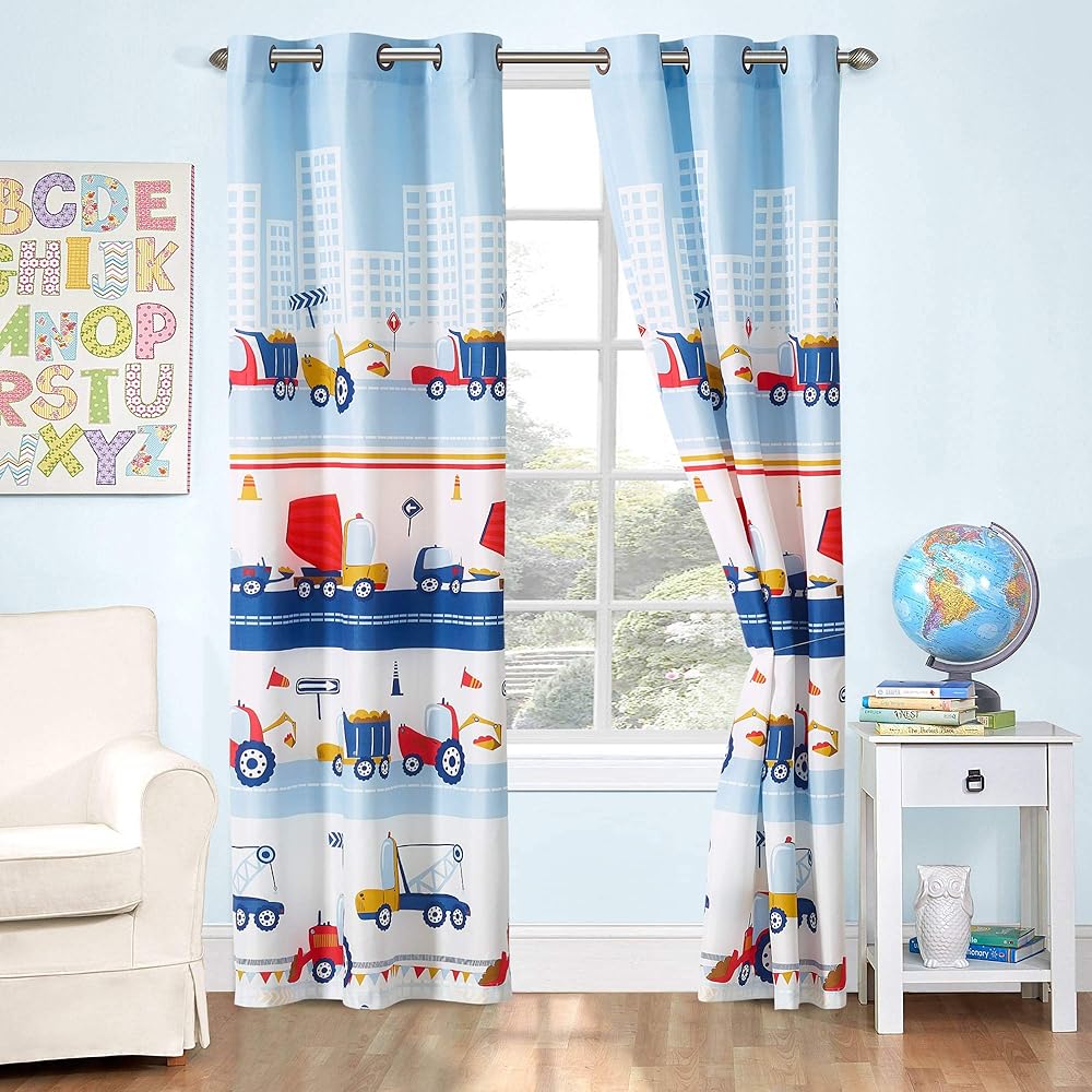 Kids Zone Home Linen 2 Panel Curtain Set with Grommet for Boys Girls Teens Bedroom Multicolor Set Construction Cranes Mobile Crane Cement Truck TLB Blue White Red Yellow New