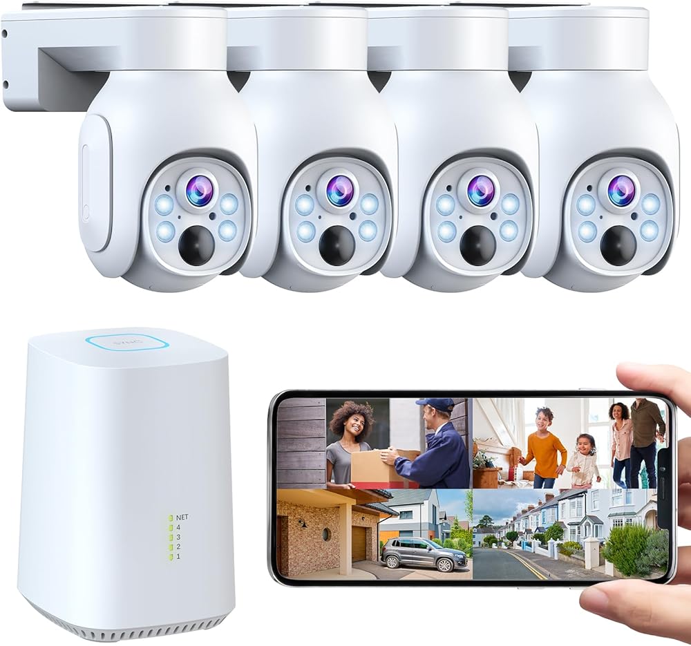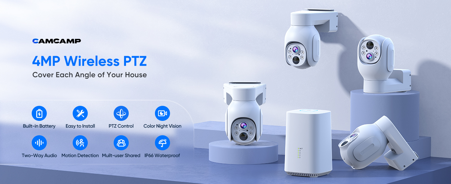 CAMCAMP Wireless Security Camera System Outdoor with PTZ 360°View, 4MP Battery Powered Security Cameras, 2-Way Audio, AI Human Detection, Color Night Vision, IP66, 4 Channel Base Station