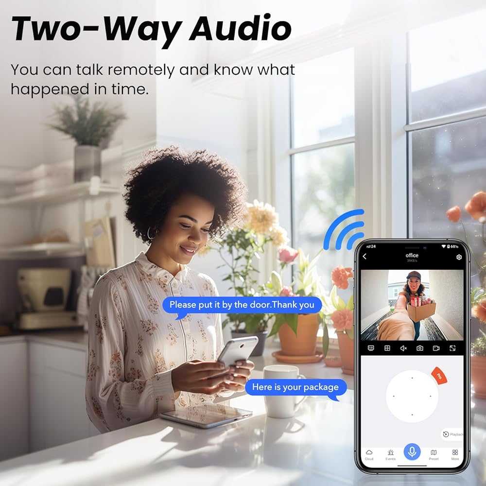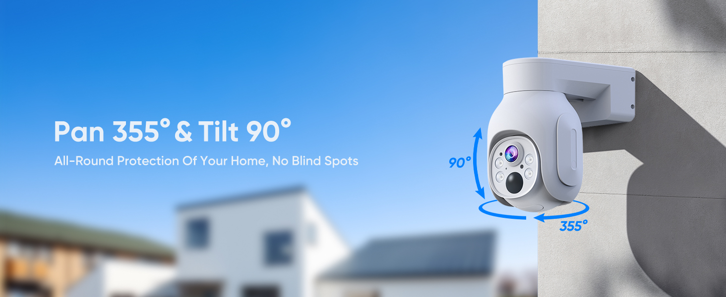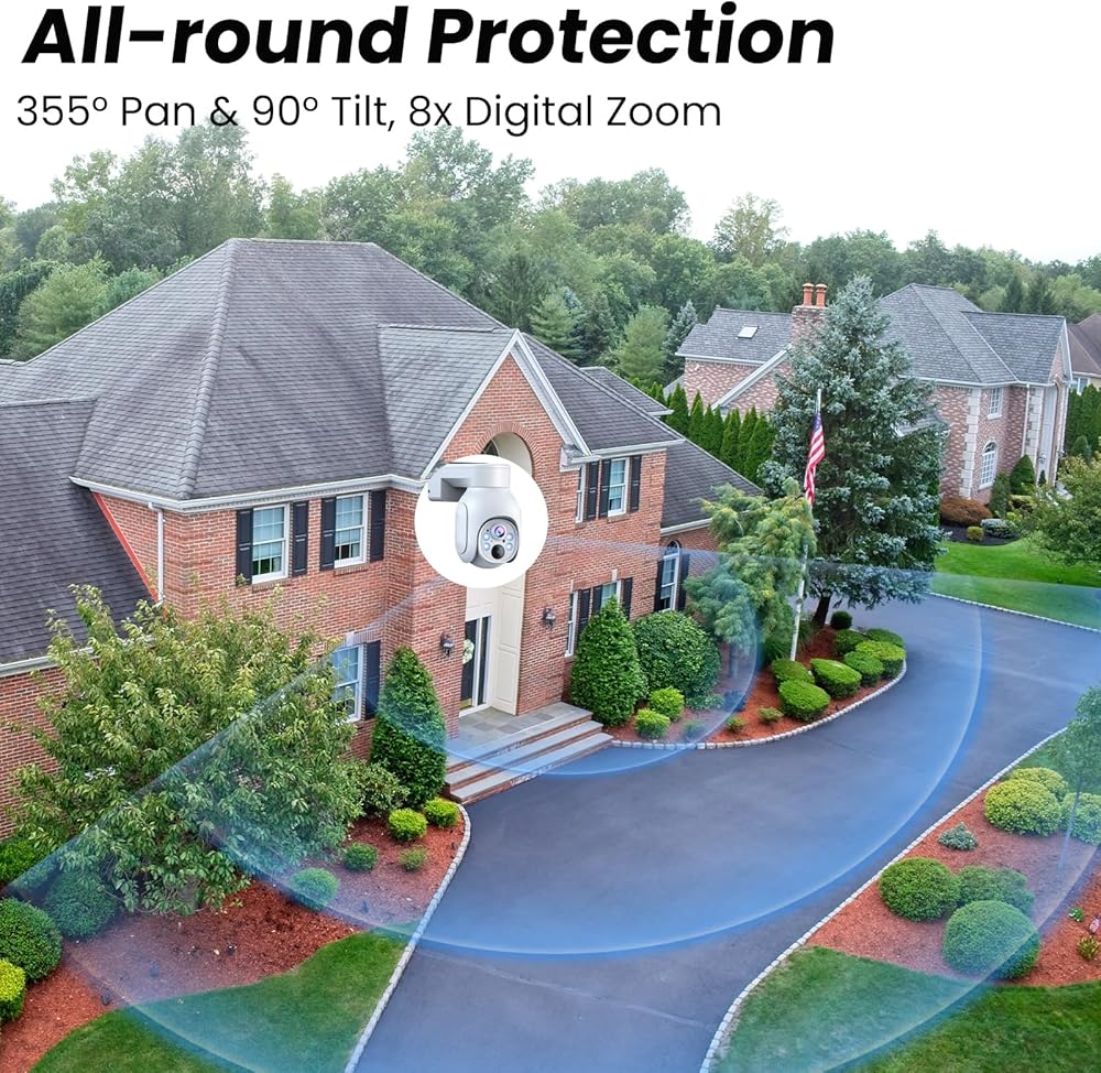 【Pan Tilt Rotation & 2-Way Audio】The Dome PTZ cameras support to pan 355°,tilt 90°, 5X digital zoom. The battery camera wireless outdoor with the built-in noise-cancelling microphone and Hi-Fi speaker supports real-time communication.