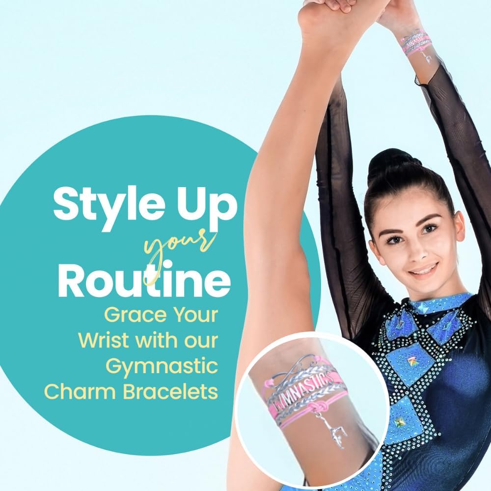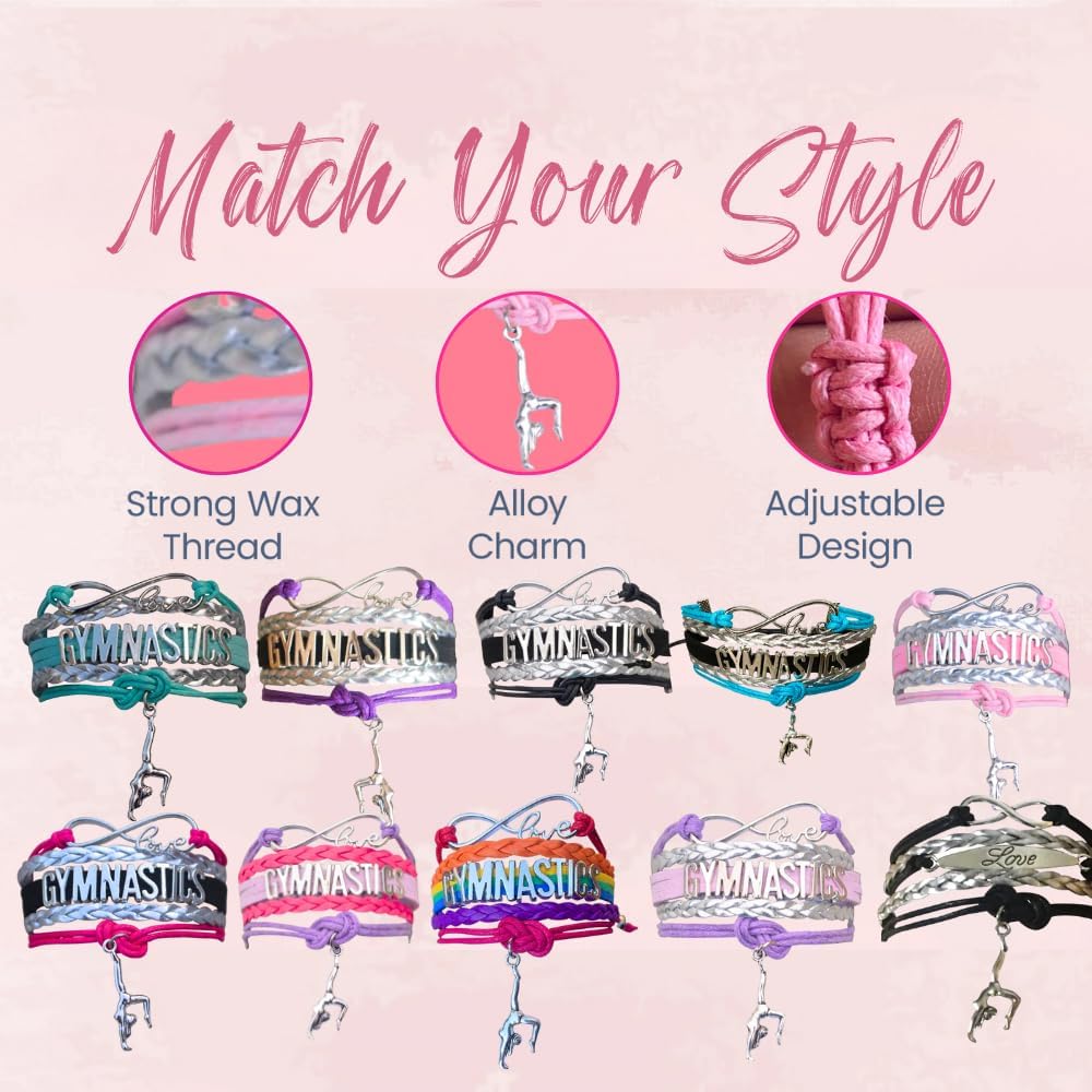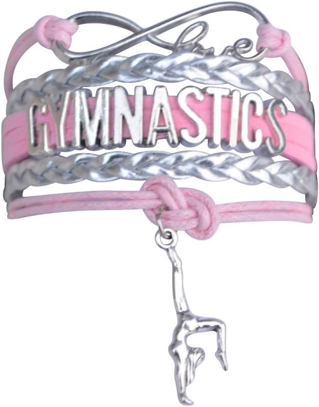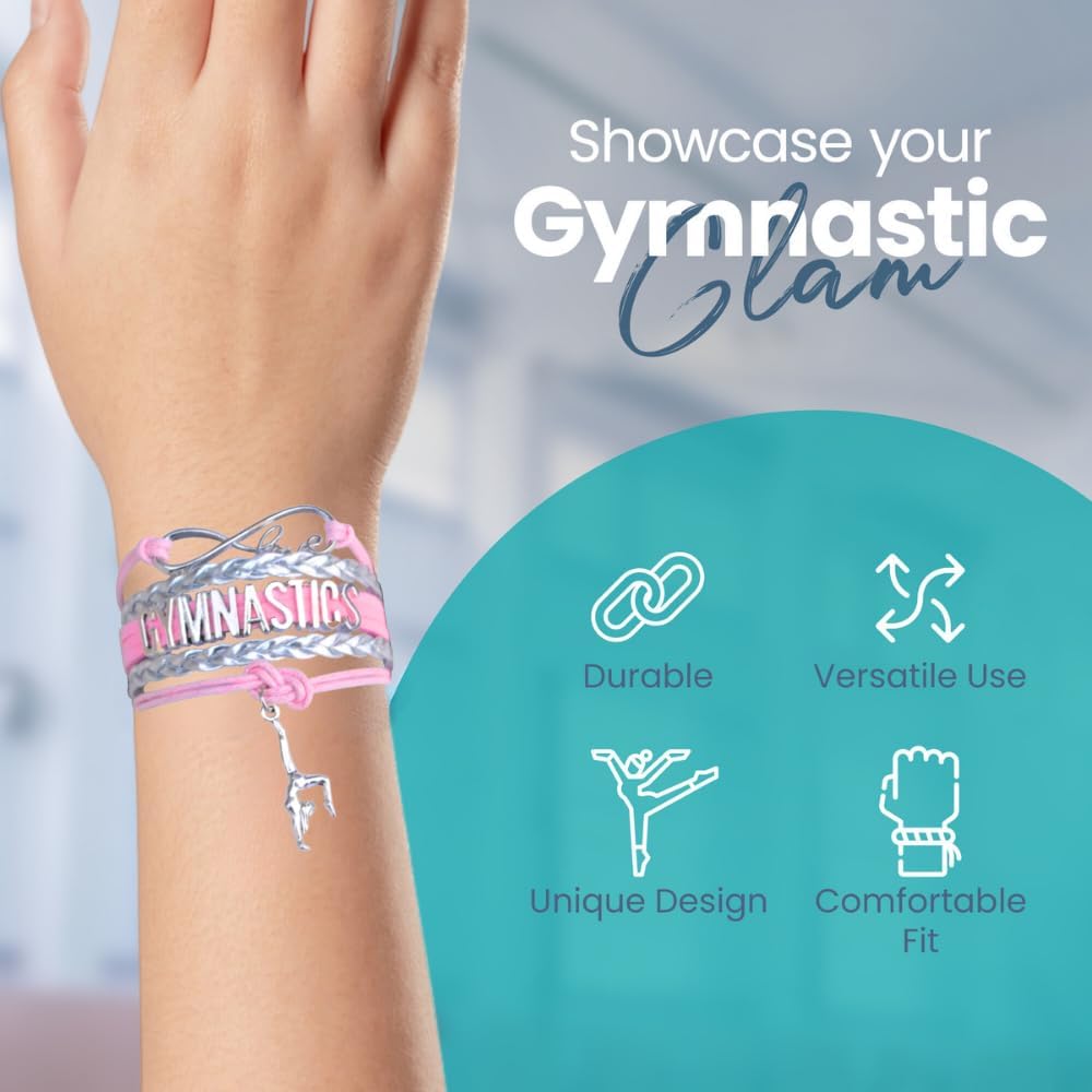 CHARM BRACELET FOR GYMNASTS: This Gymnastics Infinity Bracelet is Adjustable from 5 inches to 8 inches, featuring a sturdy adjustable clasp to hold it in place and easy to get on and off.