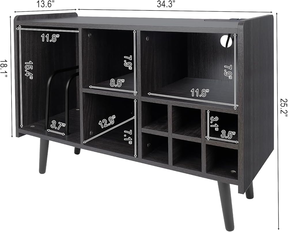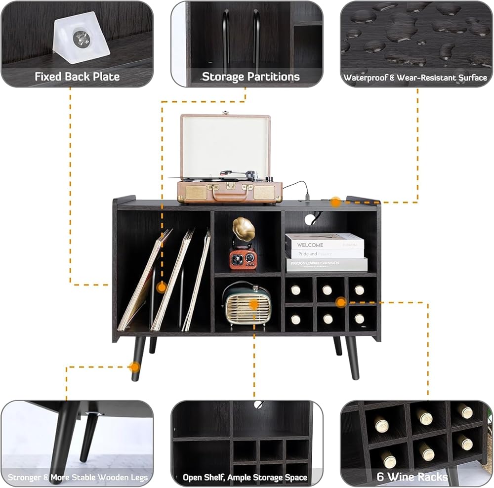 🎵【Large Storage Space】Stereo Cabinets with Turntable Shelf features 3 open storage areas, including a spacious tabletop suitable for various record players. Further, there is a 6-grid wine rack. What's more, the classified record storage shelf can hold all kinds of records up to 230 albums