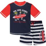 Get ready for some Disney magic when you dress your little one in this adorable Mickey Mouse swim set. This cute set includes a short-sleeve rash guard shirt and shorts featuring colorful artwork of your kid's mouse-eared friend looking cool in sunglasses and ready to surf the waves. Made from a quick-drying material and with a skin protecting UPF of 50+, this red, white, and blue striped bathing suit set is perfect for those sunny beach days.