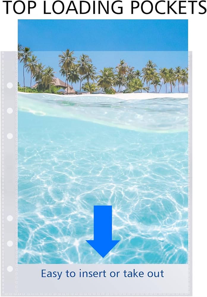 [Top-loading]: Top loading sleeve pages for easy insert and removal. Pre-punched holes down the side, easily add to any standard 6-ring binder.