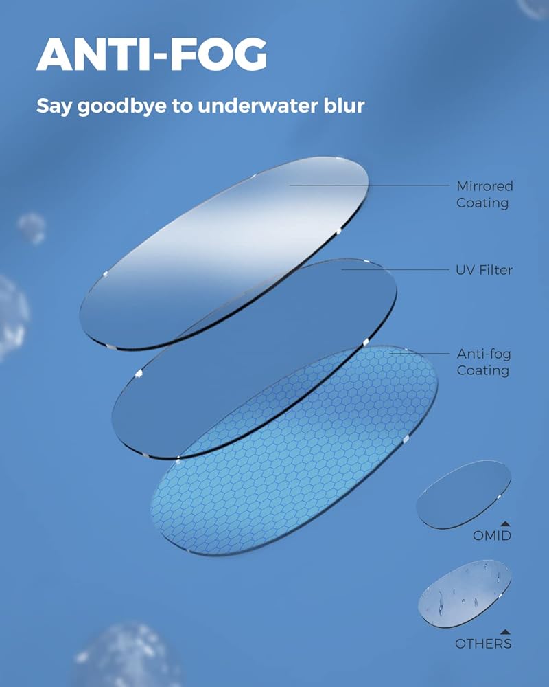ERGONOMIC DESIGN: OMID P3 swim goggles for men featured one-piece strap for a unique and personal fit; Hydrodynamic nose bridges with vertical locking system for speed, comfort & durability; Mirror coated/Smoke lenses for reduced brightness and glare, provide protection in bright conditions
