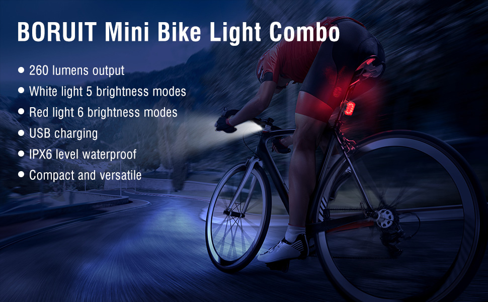 BORUIT Bike Light Set USB Rechargeable Super Bright LED Bicycle Lights Front and Back 5/6 Light Modes IPX6 Waterproof 650mah Lithium Battery Easy to Install for Men Women Road(2 Cables & Straps)