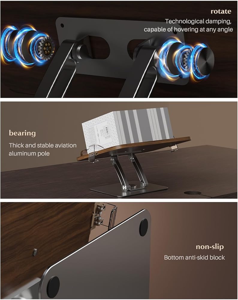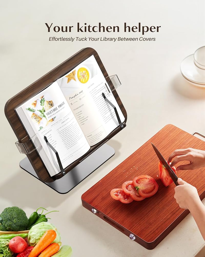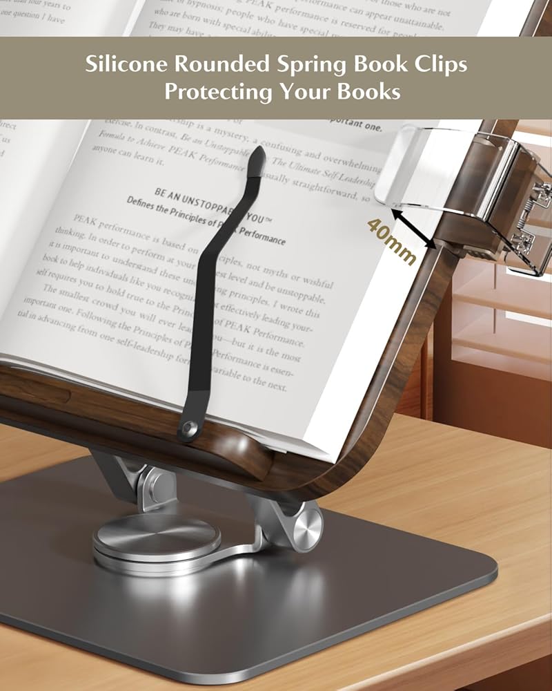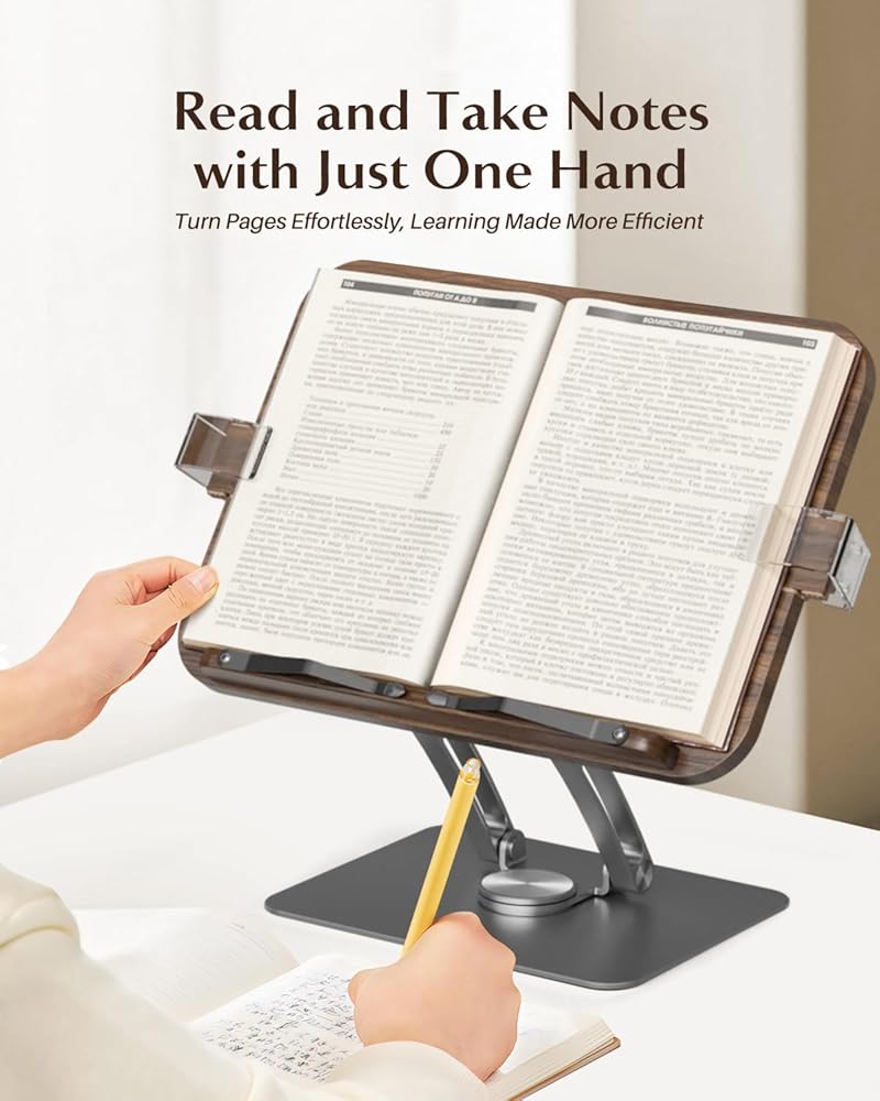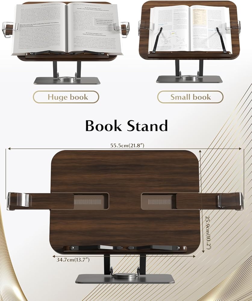 the Book Stand for Reading: Meticulously crafted from high-quality FAS solid wood, paired with an aviation aluminum rod base, this stand guarantees not only exceptional durability but also boasts an anodized coating for enduring protection against rust and corrosion. Effortless to install, its super stylish design seamlessly complements any setting, be it your home, workplace, classroom, music studio, kitchen, or beyond!