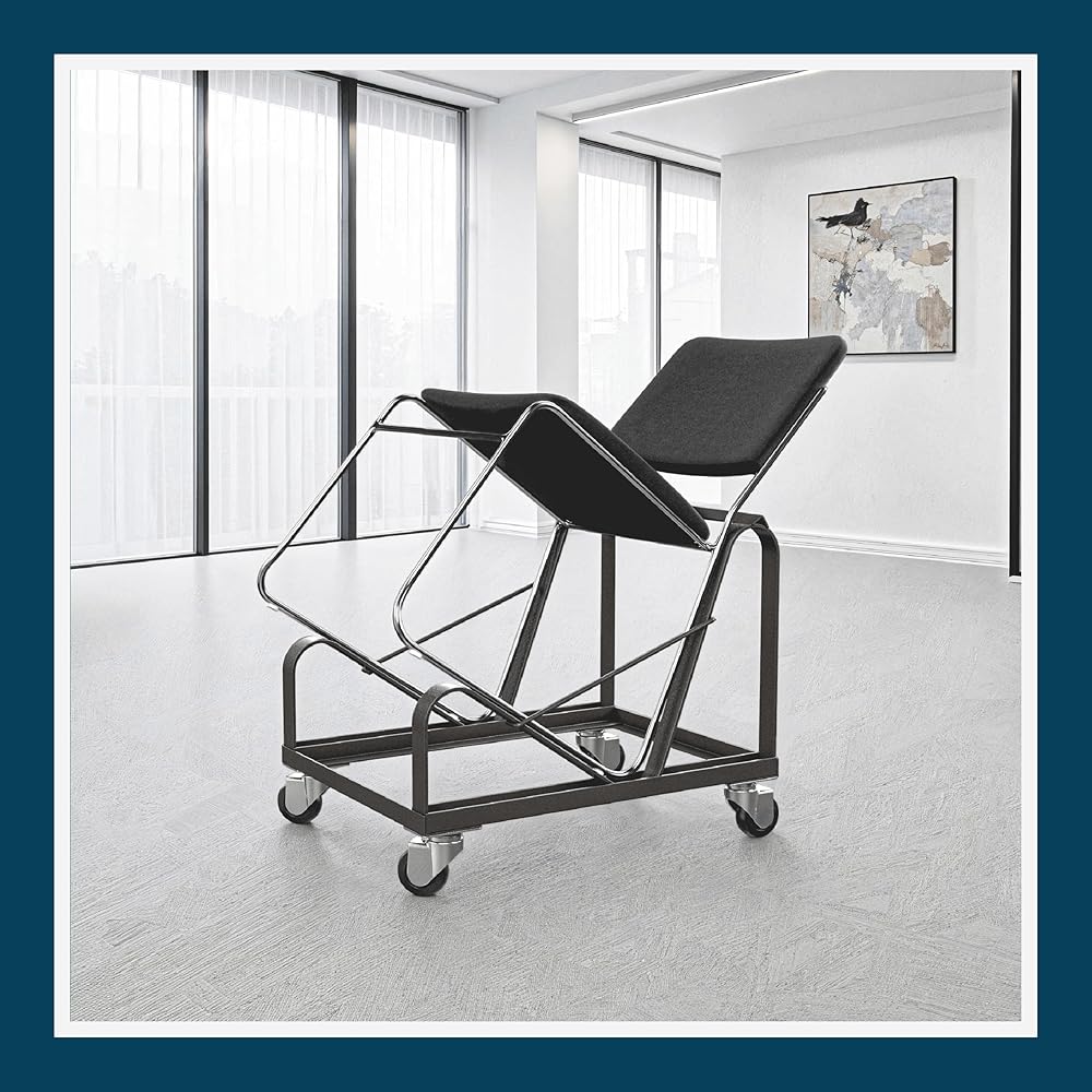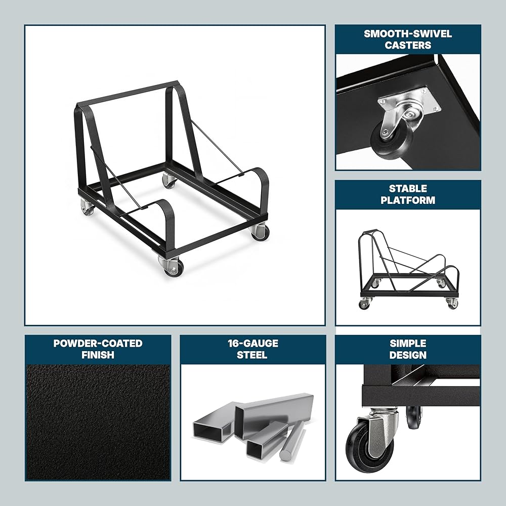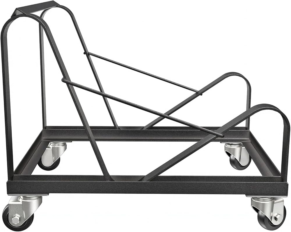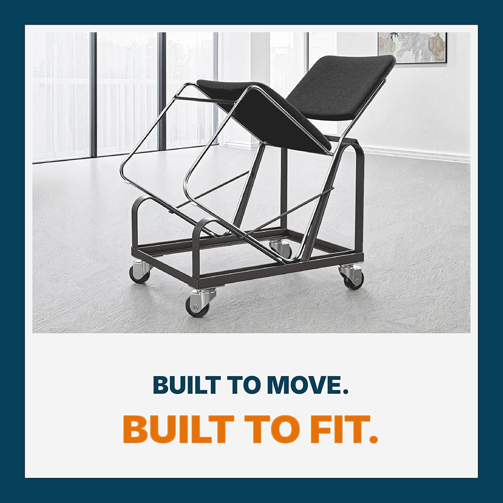 VERSATILITY: This dolly can safely store and transport the full spectrum of OEF Furnishings, or any other sled-base stack chair at or close to dimensions of 31”H x 19 3/4”W x 22”D. Glides along on 4 heavy duty castors, 2 that swivel.