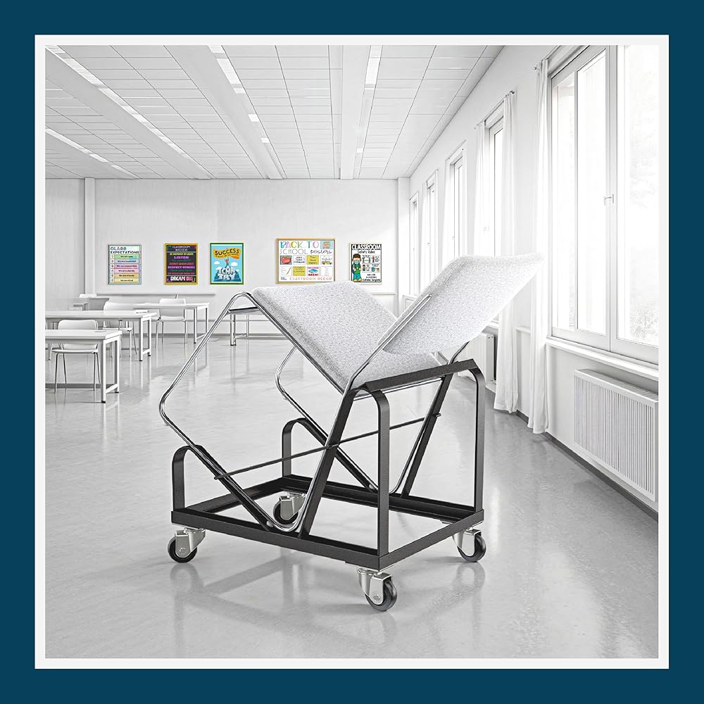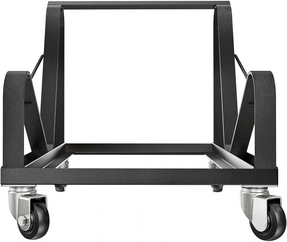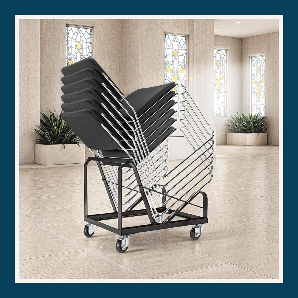 VERSATILITY: This dolly can safely store and transport the full spectrum of OEF Furnishings, or any other sled-base stack chair at or close to dimensions of 31”H x 19 3/4”W x 22”D. Glides along on 4 heavy duty castors, 2 that swivel.