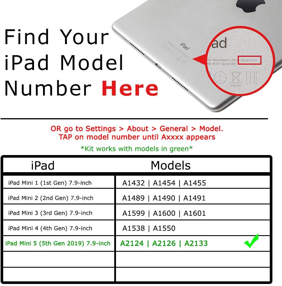 [COMPATIBILITY] Compatible only with iPad Mini 5 models 5th Generation 2019 A2126 A2124 A2133 (7.9-inch display) (Carefully check model number on back of device). Supports all carriers.