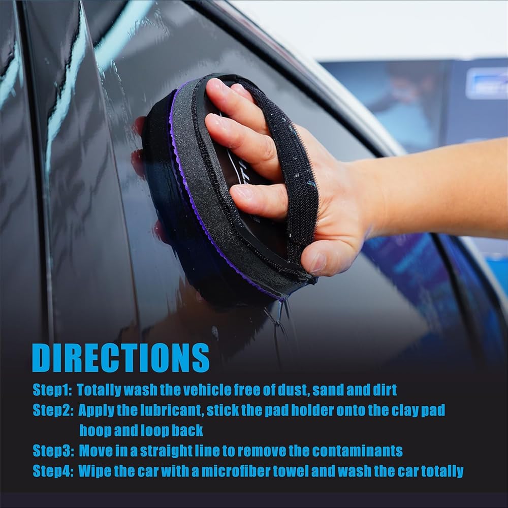 Using Steps: Rinse off the entire vehicle and stick your clay pad applicator onto your clay pad back, spray the lubricant or water onto the working surface, gently move the clay bar pad disc onto the working area. Never clay on a dry car, keep the surface moisture. And repeat until remove the stubborn stains. Clean your car again and waxing it.