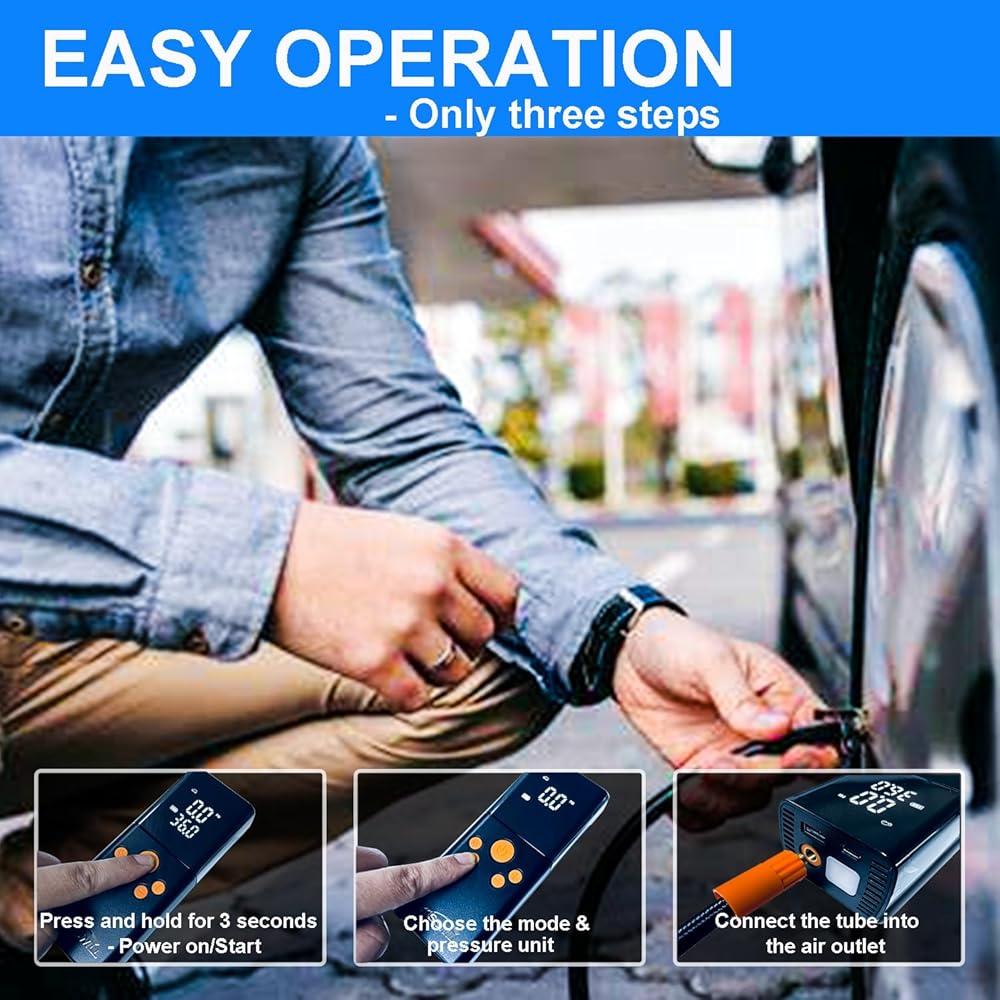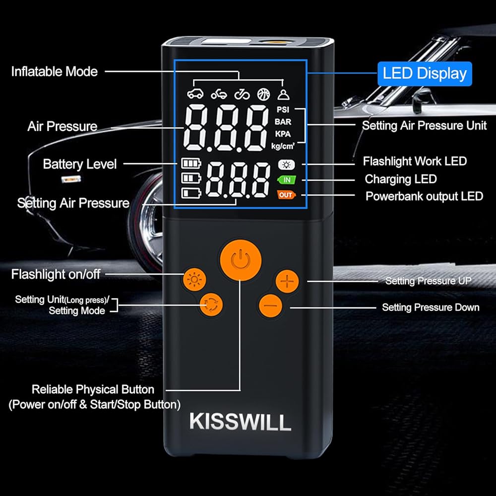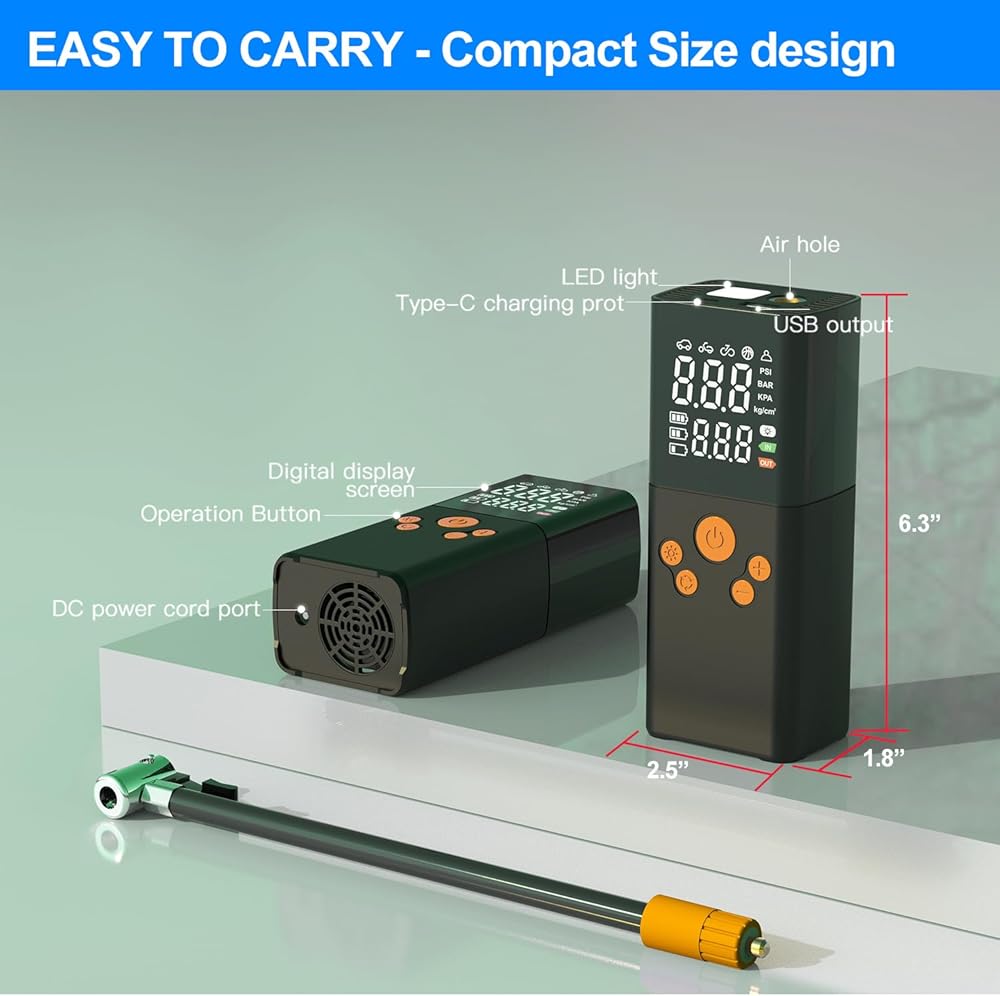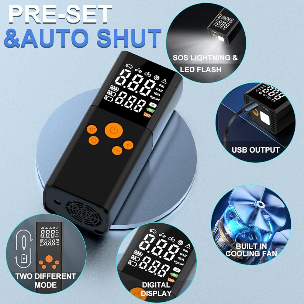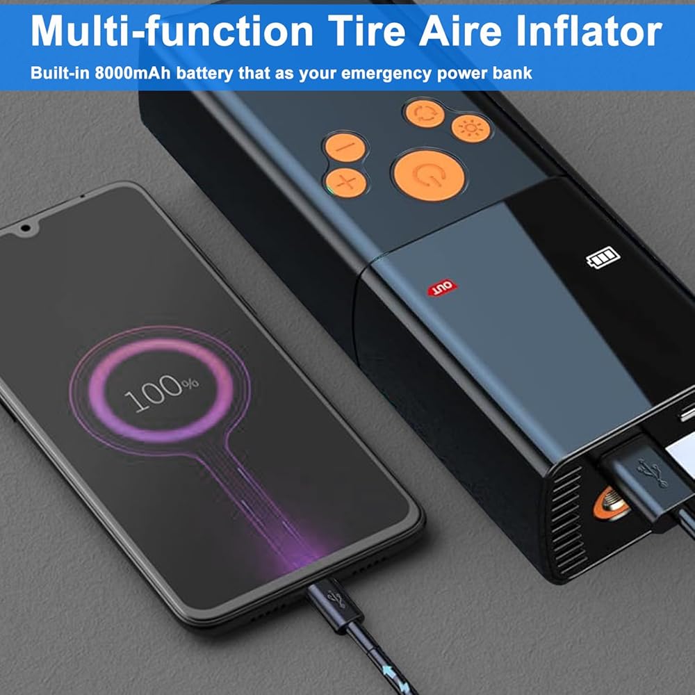 NOT ONLY A PORTABLE AIR COMPRESSOR - Normally is a portable air inflator, but also a multifunctional emergency device. It has an LED light with 3 flashing models, at the top that can be used to inflate in the dark, change tires, or warn other vehicles at night. The top of inflator includes a C-type charging port and a 5V/1A USB output port, so that it also could be a power bank for charging your phone or other device.