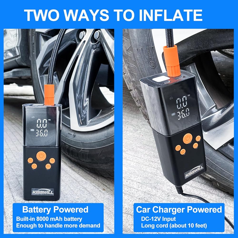 BETTER PERFORMANCE DUAl POWER AIR INFLATOR - 2X Faster Tire & Wheel Inflation, this compact car tire portable air compressor with high performance motor can pump up a standard car tire from 25 psi to 36psi within 2 minutes. This tire inflator comes with 8000 mA Battery & 12V DC input power. The inflation speed is 2X faster than other ordinary cordless inflators on the market with a 30% increase in power.