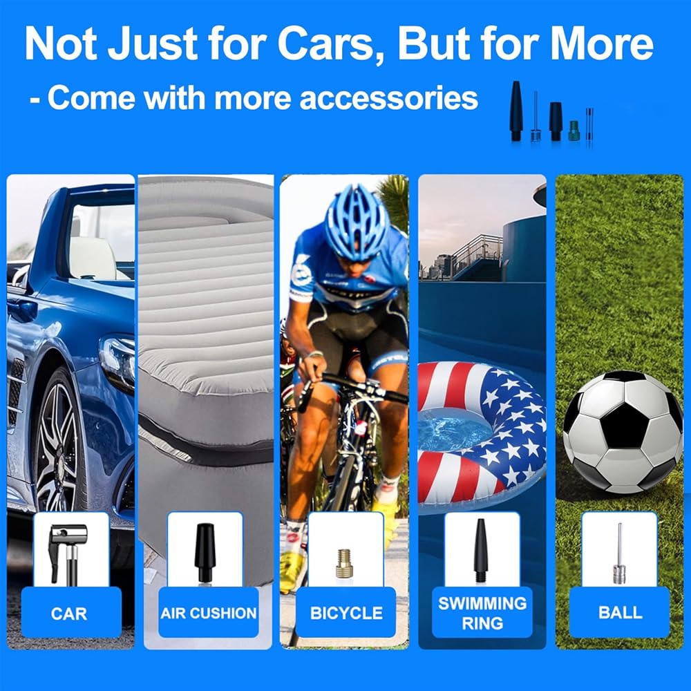 WIDELY USE - This portable air inflator have 5 Inflation mode, you can always inflate your basketball, soccer ball, tires, air bed, bicycle, motorcycle and more, and also save more time by inflating balloons during your party with your family.
