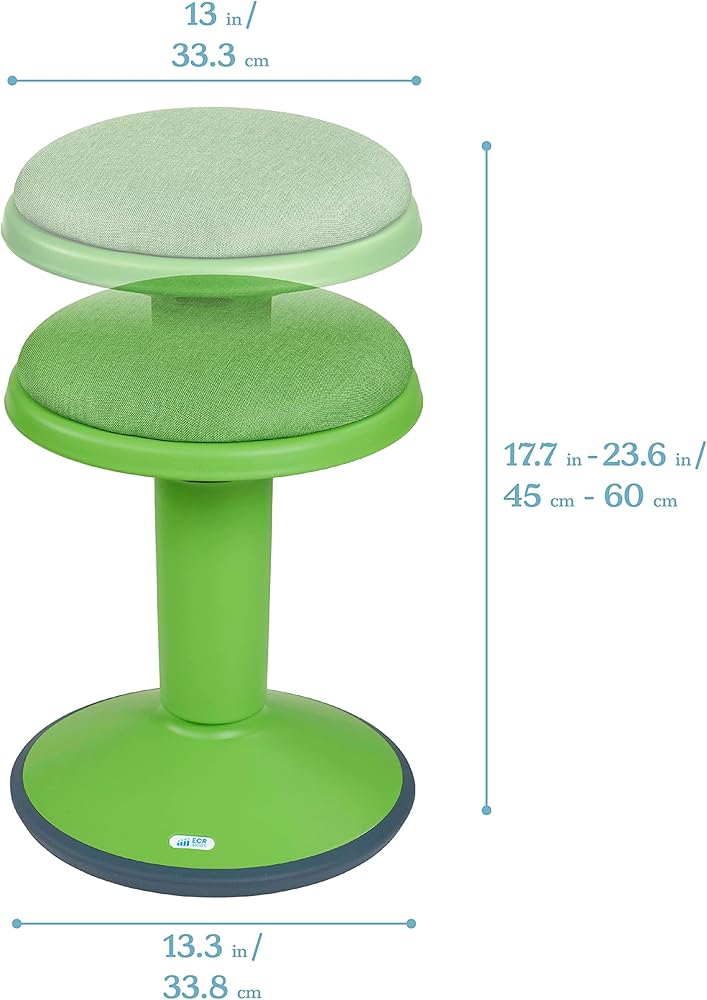 Support the body's natural need for movement with the SitWell Adjustable Stool with Cushion. Seats that rock, tilt, and swivel allow for freedom of movement and encourage good posture and alertness while learning and working. This movement stool features a cushioned foam seat that provides added comfort while sitting. The curved rubberized base helps keep the stool upright on hard or carpeted surfaces. The seat height adjusts from 17.7" to 23.6" with the push of a button to accommodate a range of users; it requires a minimum of 105 lbs. to adjust the seat down. The active chair is designed for everyday use in a school, home, or office. These functional stools are a fun way to provide extra seating in any learning space. Easily rearrange workspaces to create a dynamic collaborative environment between students or use them for individual work study. Continuous small movements help engage the body and brain, aiding concentration without distracting others nearby, while also supporting balance and coordination. The lightweight seat is the perfect grab-and-go stool for taking the classroom indoors and out. This wobble seat is maintenance-free with no hardware to tighten.