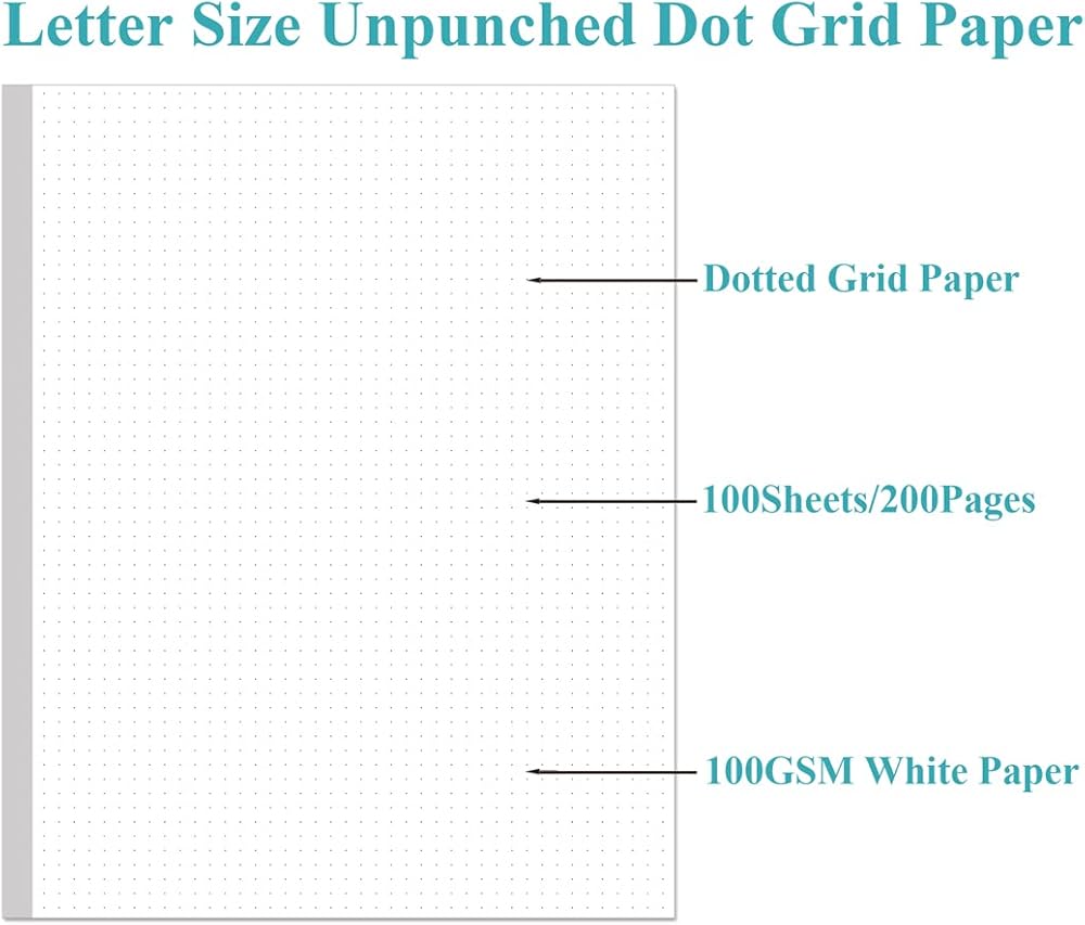 This dotted grid paper size of 8.5" x 11", 5mm apart dot grid, double side clear black dotted. This dotted filler paper with 100 sheets/200 pages for 200 days, improve your productivity with this daily organizer. Loose leaf bullet paper for standar 7-hole/3-hole inserts, refill paper for A4 binder, Size 5, Folio Size etc, DON'T fit 6 ring binders. Refill grid paper is used to high quality 100gsm pure white premium acid-free paper, so you can confidently use most pens, pencils, and markers without ghosting and bleed-through. This refill dotted grid paper for school notes, meeting notes, or any form of writing, our ruled sheets have subtle gray lines spaced by a quarter inch.