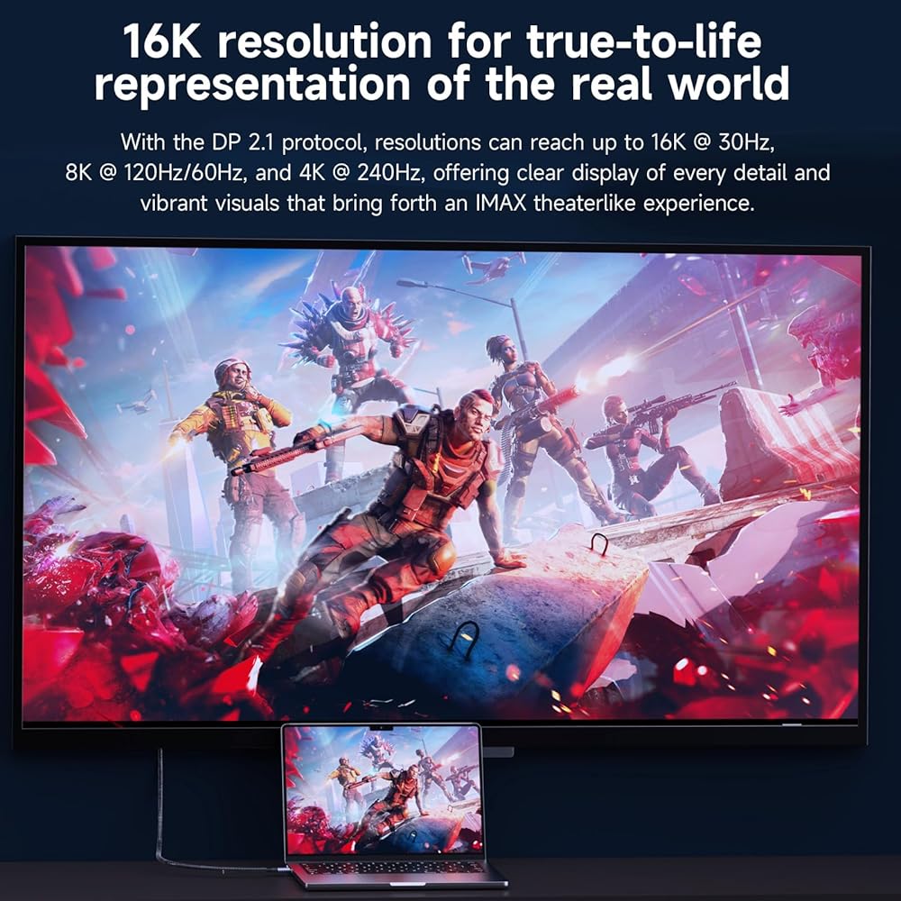⚡【8K USB 4 to DisplayPort Cable】 USB C to DisplayPort 2.1 cable supports MAX 16K@30Hz, 8K@60Hz, 5K(5120x2880)@60Hz, 4K(5120x1440)@120Hz, 4K@144Hz, 2K@240Hz/165Hz and can drive up to 4 1080P monitors. Avoid screen flickering and audio clipping and stream sports events, movies, photos and albums smoothly.
