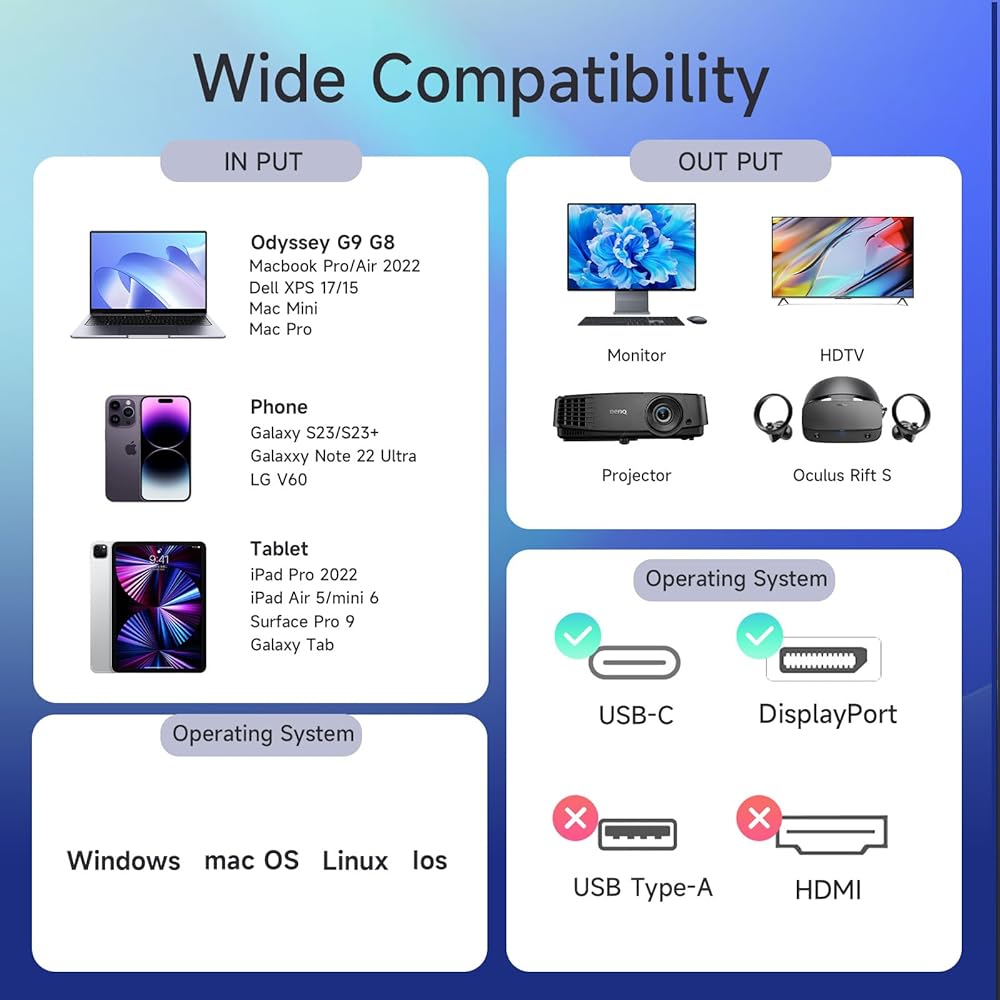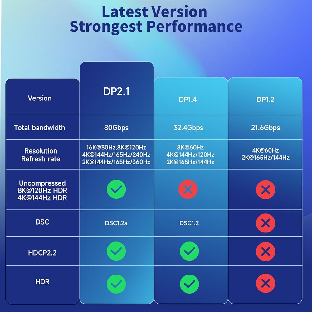 🚩【VESA Certified DisplayPort 2.1 Cable】USB C to DisplayPort 2.1 cable features an unprecedented bandwidth of 80Gbps, nearly 3 times what was available in the previous DP 1.4 spec, Stable and High-speed transmission without signal loss. Note: It is backwards compatible with previous DP 1.4 and DP 1.2 standards. Avoid screen flickering and audio clipping and stream sports events, movies, photos and albums smoothly.