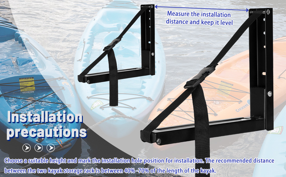 【Easy to Install】: The installation of the kayak rack is simple, you only need to choose the location to install on the wall and insert the matching screws on the wall to successfully install. The canoe rack supports a weight of 100 pounds, and you can adjust the installation distance between the two supports to fit the length of your canoe. If you have any questions after receiving the product, please feel free to contact us at any time, and we will do our best to achieve your satisfaction.