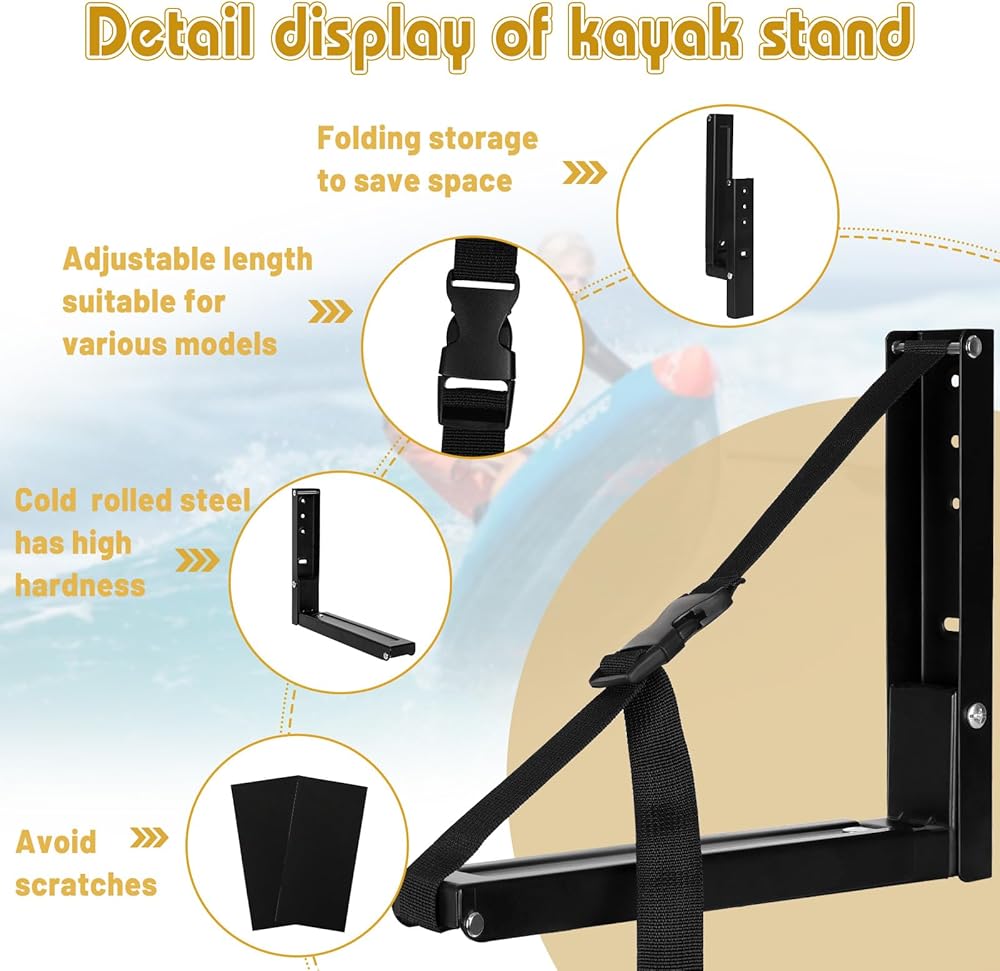 【Foldable and Retractable】: The kayak rack storage adopts a foldable design, which can be folded and stored when not in use, opening and closing smoothly, greatly saving storage space. Humanized design, with a retractable design at the bottom of the rack, with a retractable range of 11.8 inches to 18.5 inches, suitable for kayaks of different widths.