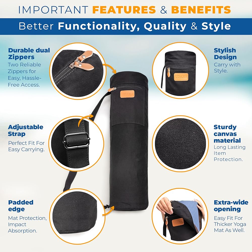 • 💪DURABLE and CONVENIENT: Crafted with heavy-duty canvas material, the Udana yoga mat carrying bag ensures lasting protection for all your yoga equipment and gym accessories. The dual zipper head design provides super easy access to your yoga mat thick without snagging or breaking. The adjustable strap is designed for a perfect fit, making it effortless to carry your yoga stuff wherever you go.