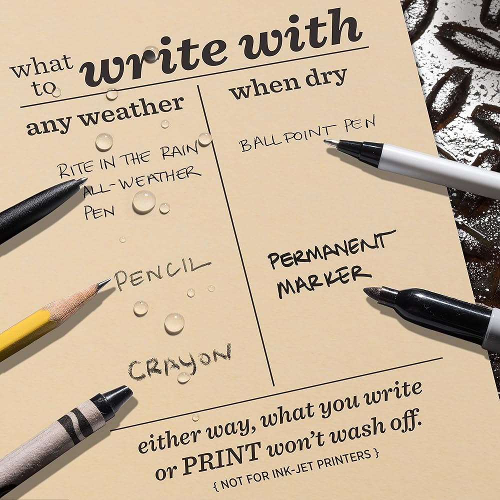 WRITE IN THE RAIN: When wet, use a standard #2 pencil or an all-weather pen. Standard ballpoints and permanent markers will work when paper is dry. Water-based inks will bead or wash off Rite in the Rain Paper.