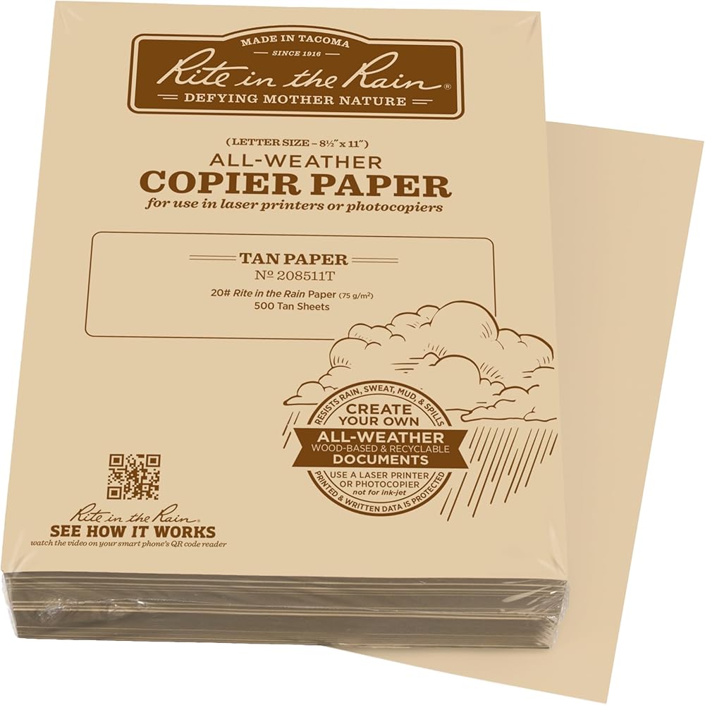 Copy or laser print your own all-weather forms, charts, maps, and worksheets on patented Rite in the Rain All-Weather Copier Paper. Have the convenience of using your existing data sheets on a paper that can survive in any weather condition. For pennies a sheet, Rite in the Rain enables you to work efficiently, regardless of the environment. Paper is 20# bond weight. Completely recyclable wood-based paper. Copy or laser print both sides. Not for inkjet printers.