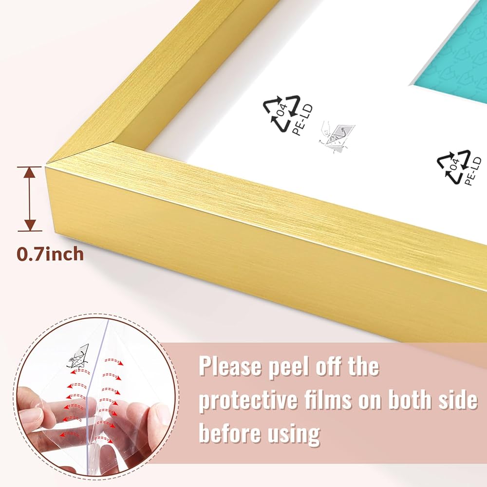 PACKAGE INCLUDES:1 pack poster frame in a gold finish, fits 24x30 picture without mat, 22x28 picture with mat, with plexiglass cover instead of glass, bring safe and higher definition. This plexiglass panel is covered with protective film on both sides, after removing it both sides will be very clear. Remember to tear them off.