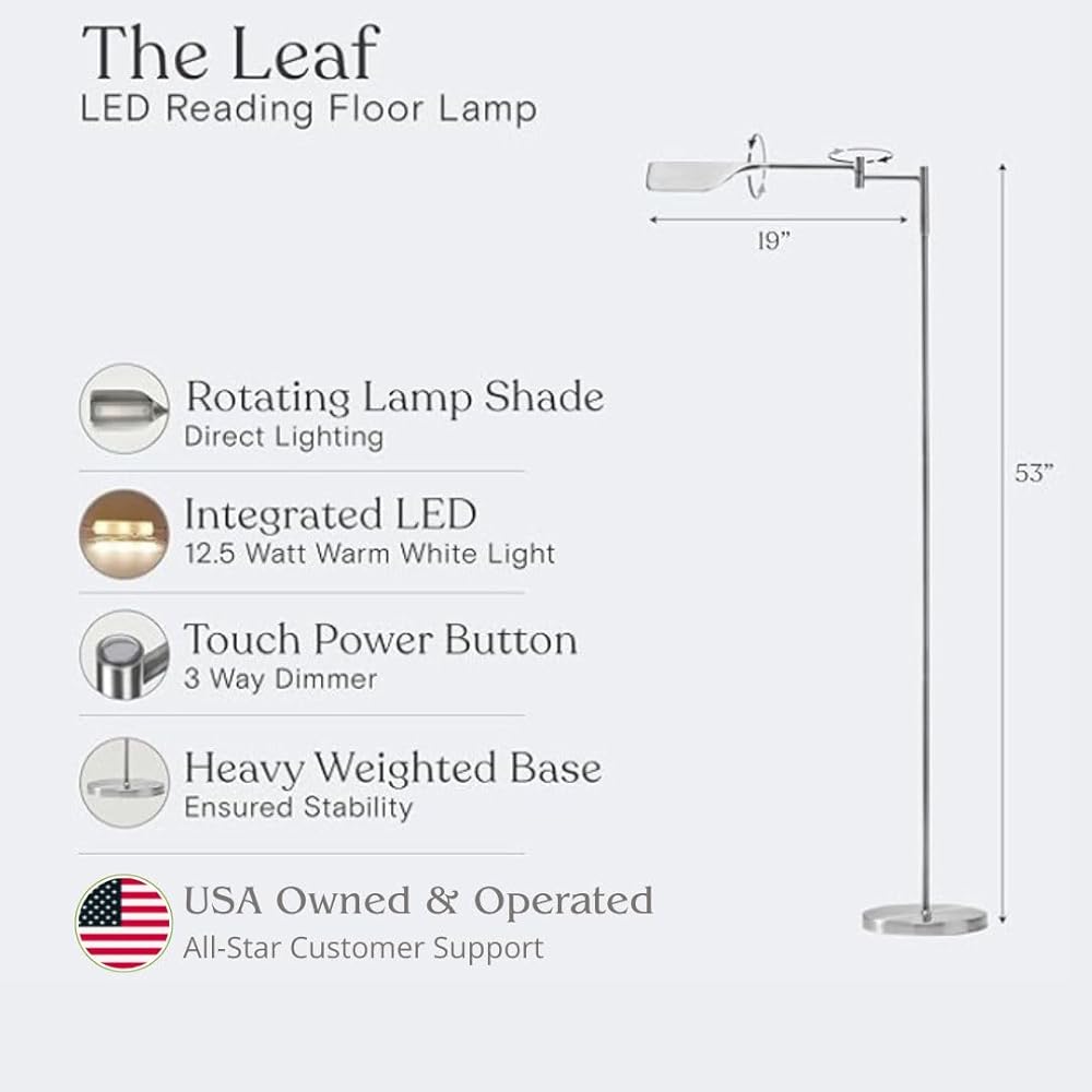20 Year Lifespan Tall Lamp: The Leaf standing task lamp for living rooms has an integrated 12.5 Watt power-saving LED light bulb, rated to last 20,000 hours - 20 years with normal use - making buying replacement bulbs a thing of the past. The Leaf offers 3,000K warm white LED technology with 1150 lumens, outperforming halogen, CFL, or incandescent bulbs. Additionally, the base of the adjustable floor lamp has a sturdy center of gravity, reducing the possibility of the Leaf tipping over.