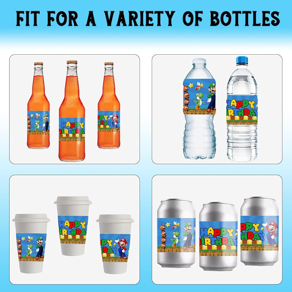 【سهلة الاستخدام】مستلزمات تزيين حفلات ألعاب الفيديو هذه مصنوعة من مواد ورقية ذاتية اللصق عالية الجودة، مع طلاء لامع وطباعة شفافة وسطح مقاوم للماء، يمكنك بسهولة تقشيرها ولصقها حول زجاجة المياه.