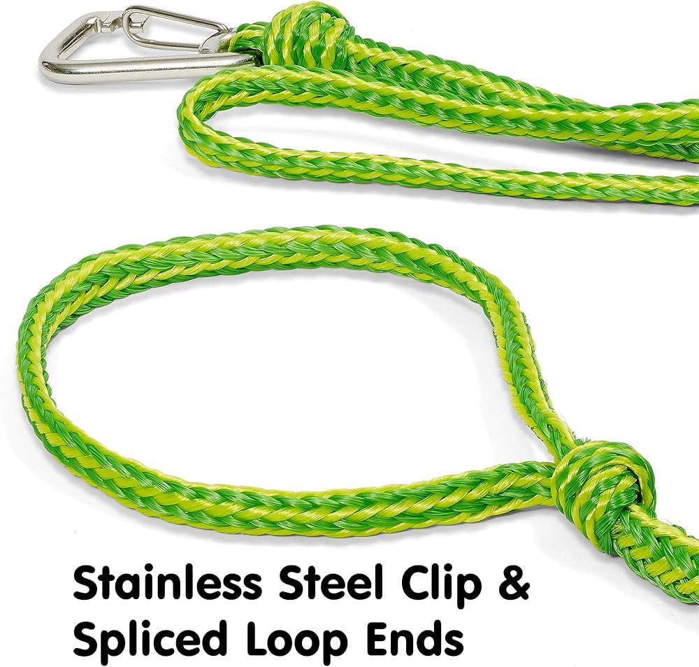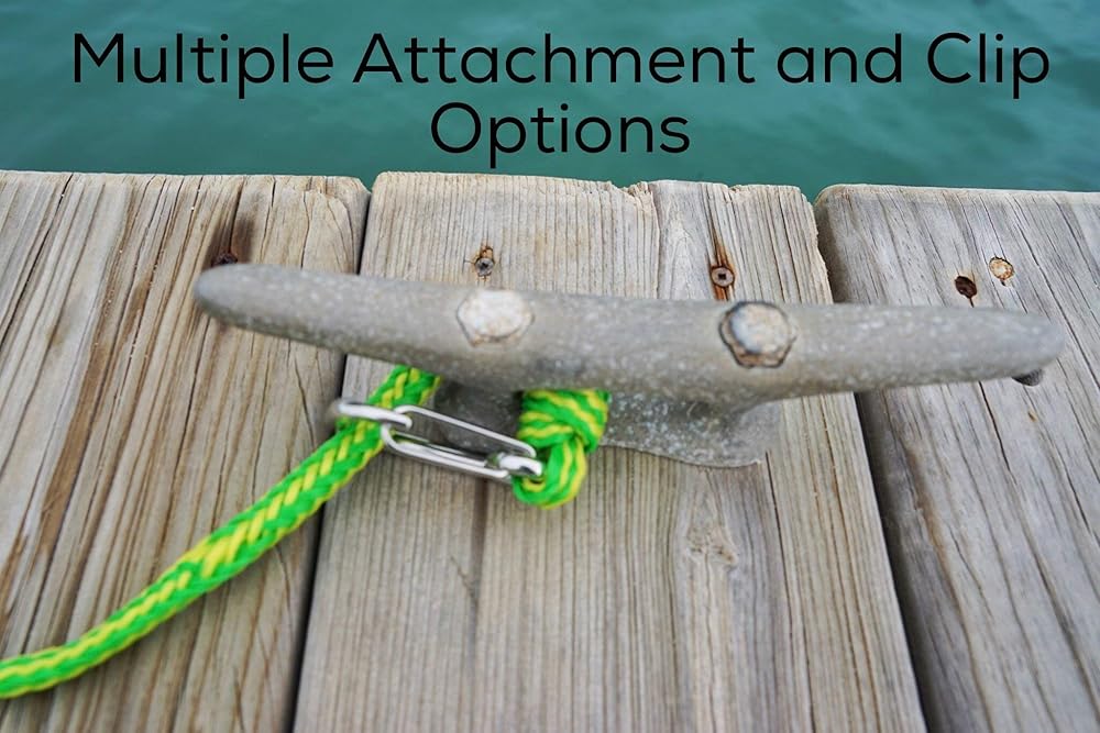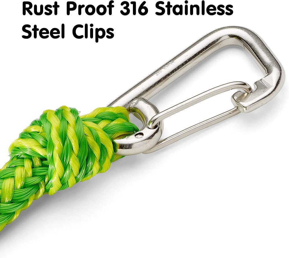 SALTWATER AND FRESHWATER USE: Built to be used in either freshwater or marine environments our dock lines feature a rust proof 316 stainless steel snap clip on one end, and custom spliced 10" long loop on the other.