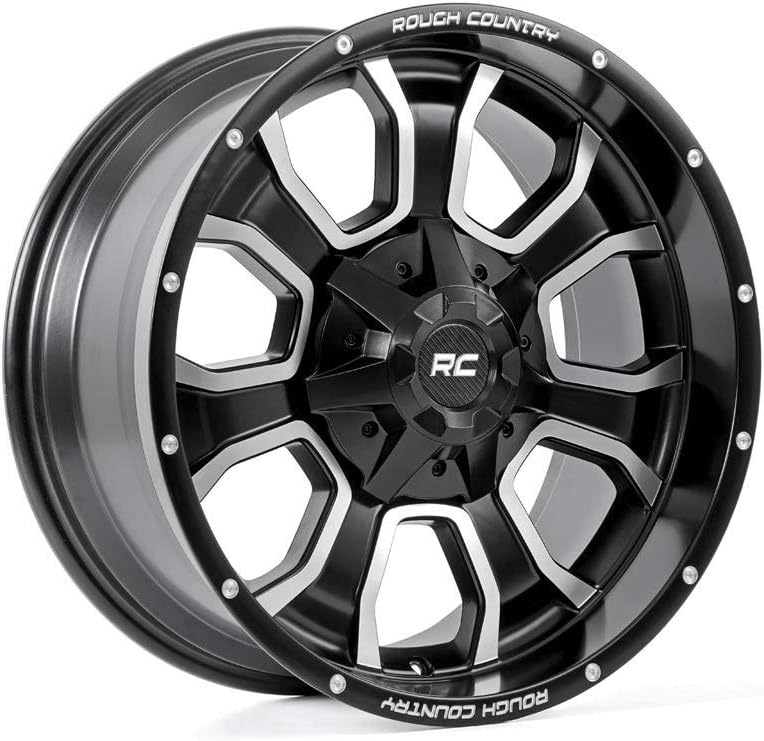 Set yourself apart from the pack with Rough Country's One-Piece Series 93 Wheels. This 7-spoke black and machined wheel offers an incredible look that's sure to turn heads. This one-of-a-kind wheel features 7 spokes that flare out near the lip for a dramatic visual style that's perfect for any lifted vehicle. This stylish wheel features a gloss black coat with machined accents that pop under any truck or Jeep. Rough Country's Series 93 is a one-piece wheel design, constructed from a single piece of heavy-duty aluminum for the optimal balance of weight and performance. Each Series 93 Wheel includes dual machined Rough Country logos and a center cap with RC carbon fiber logo design and includes a limited lifetime warranty.