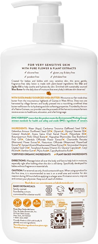 100% GOOD FOR YOUR BABY:This gentle, soft and non-greasy body lotion moisturizes dry, sensitive and irritated. Perfect for babies, kids and adults. Fragrance-Free. EWG Verified