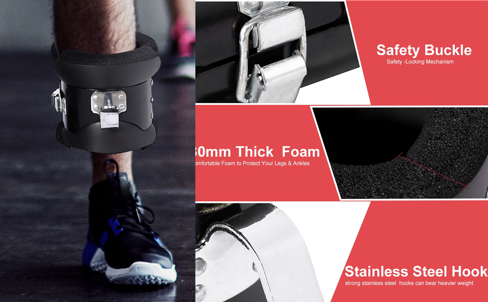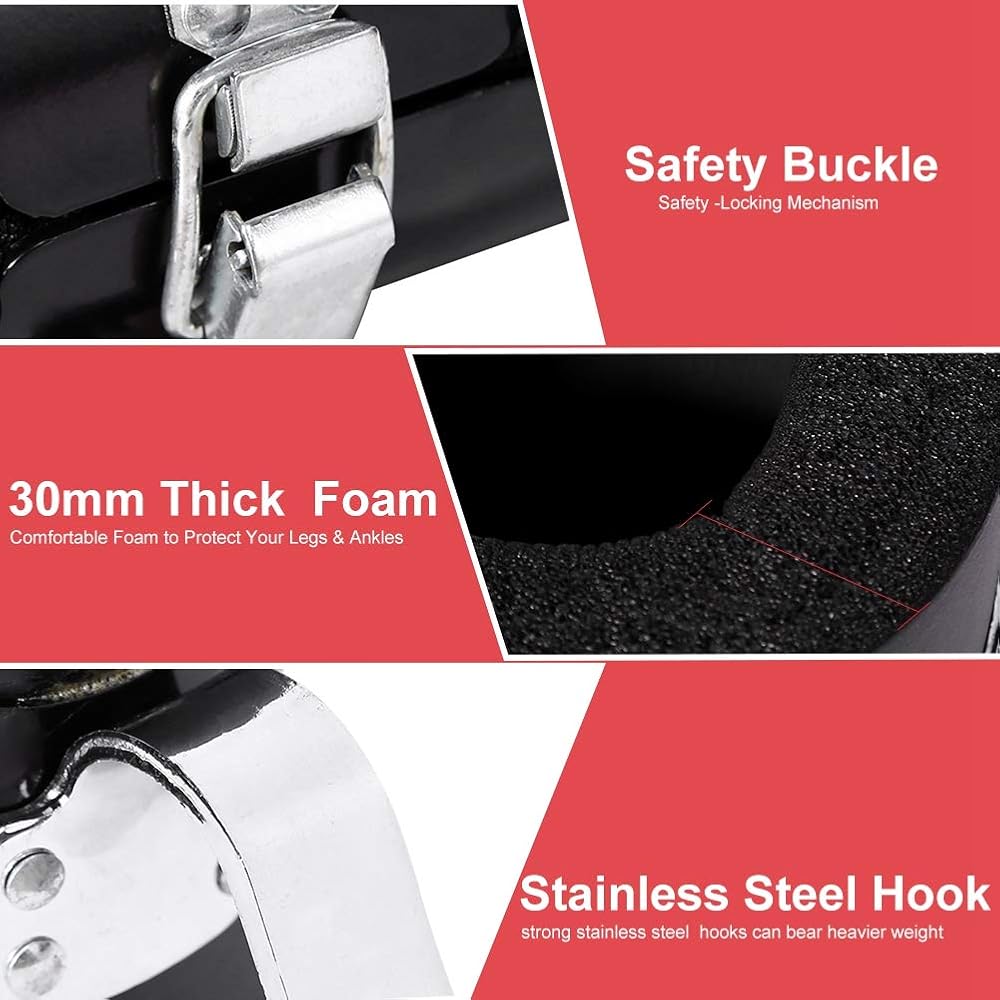 COMFORTABLE FOAM PADDING AND STURDY HOOKS:Comfortable padded sides for contoured fit around your ankles. Sturdy hooks fit over bars and buckles close the pads.