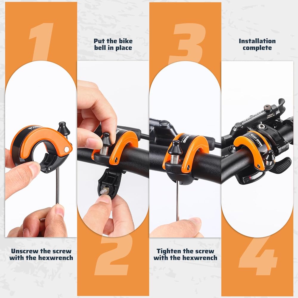 🔔【EASY to INSTALL】The scooter bell is very easy to install, the package contains a bike bells for adults and an Allen wrench, screw the bike horn to the bicycle pole, it can be installed in 2 minutes and is very strong, even on bumpy roads, it It won't shake and remains stable.