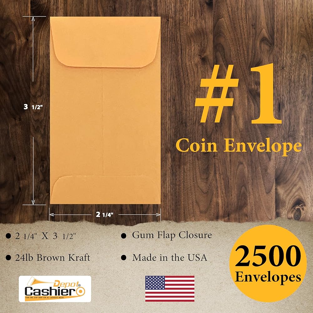 #1 Coin Envelope Kraft 2 1/4 X 3 1/2, Premium 500 Envelopes per Box, Perfect for Coins, Small Parts, Nails, Seeds, etc...Heavy 24lb. Paper, Gum Flap, Proudly Made in the USA.
