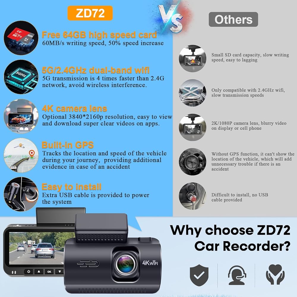 The smart dash cam comes equipped with a specially designed 64GB SD high-speed card. It supports 24/7 continuous full HD 4K smooth recording and playback, ensuring that important video content is captured. It boasts a higher write lifespan, minimizing unexpected situation like recording interruption or card failure. With the car camera, you can record beautiful scenery anytime while travel, and share interesting trips with family and friends. (We recommend using C10 &U3 high-speed microSD card.)