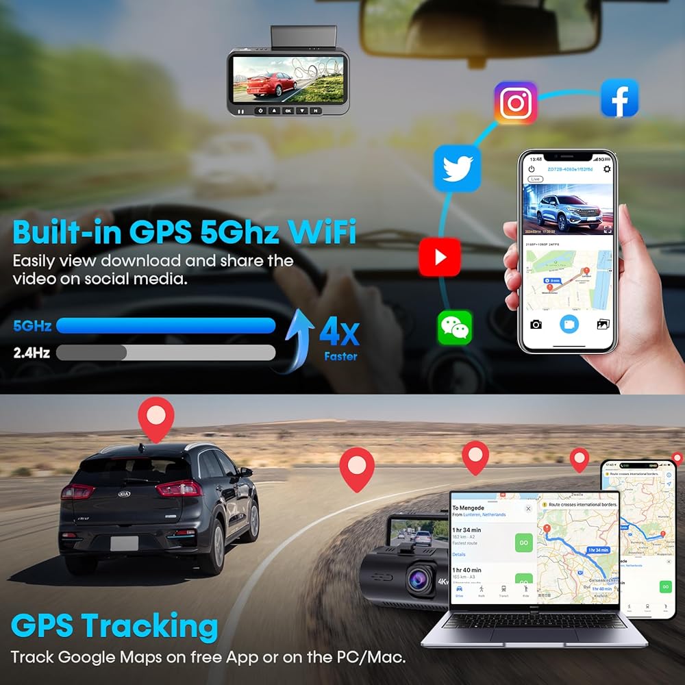 This dash cam with app can quickly connect to a free secure app via 2.4G WiFi or the faster and more efficient 5G WiFi wireless signal. And you can easily view and download videos and effortlessly share your journeys on social media with friends. Also the dash cam with gps and speed accurately records your vehicle's speed, driving route, and location in real-time. You can view real-time GPS logs on the mobile application or replay them on your computer.