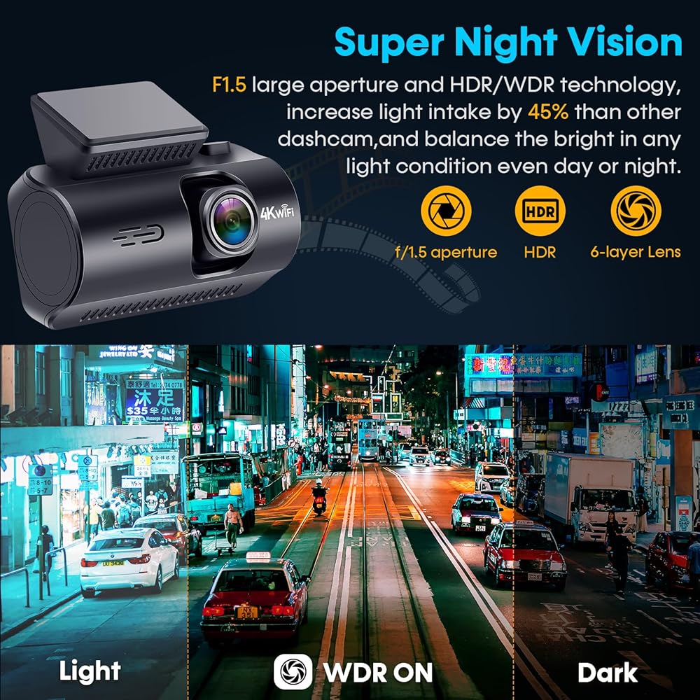 Using more advanced 22nm chip, Sony image sensor and 6-glass lens, 4K 2160P front camera and 1080P rear camera are enable to easily capture license plate information of reckless drivers in accidents, and record the surrounding environment. It ensures complete and stable record your safe driving behavior. With F1.5 large aperture and HDR/WDR technology, the dash camera for cars increases light intake by 45% than other dash cams, sending vivid clear image even in strong or weak lighting condition.