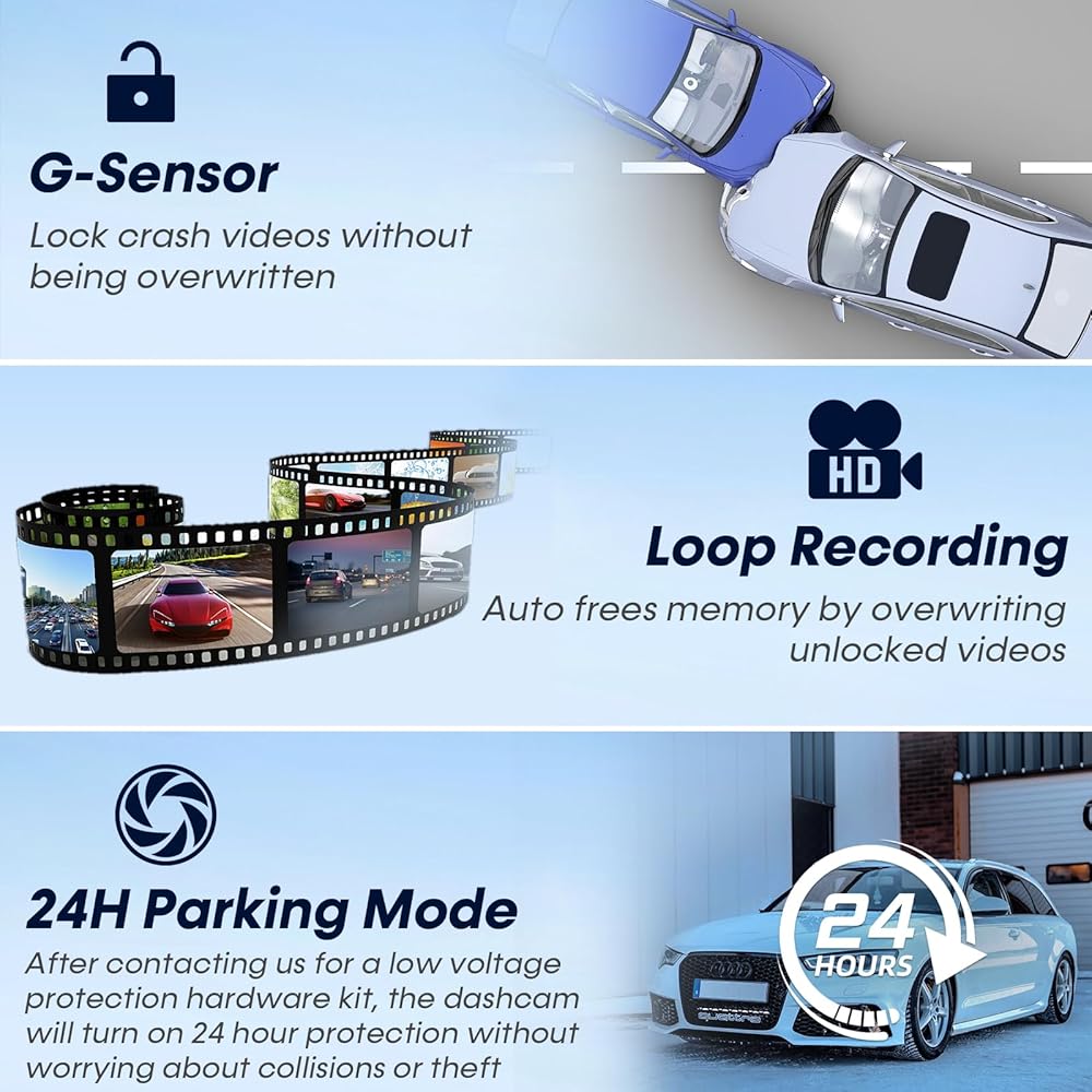 In parking mode, after contacting us to obtain a hardware kit with low voltage protection, this security camera for car automatically activates and starts recording upon detecting vibrations when your car is parked. It provides 24 hour protection for your vehicle, whether in the event of a collision or attempted theft. And in parking mode, the dual dash cam features motion detection and delayed shooting capabilities.