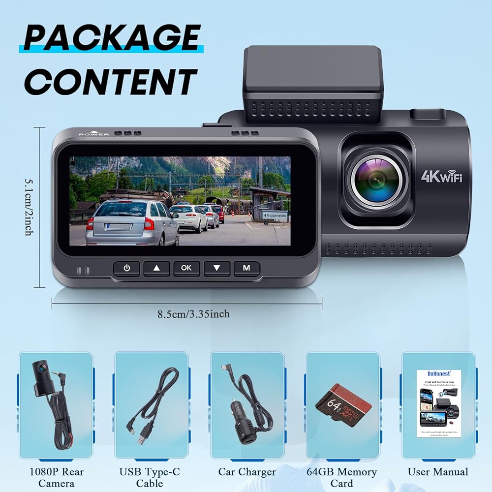 The 3.16 inch screen of wifi dash cam has a good size for the windshield, small and compact, takes up little space and don't block the driver's view of road. Using IPS screen will make images are rendered with greater clarity and finesse, avoiding issues like image trailing and jitter. And 4k dash cam is made from professional aluminum alloy material, providing superior heat dissipation, enhanced fire resistance, and greater environmental friendliness, safety, and durability than other dashcams.