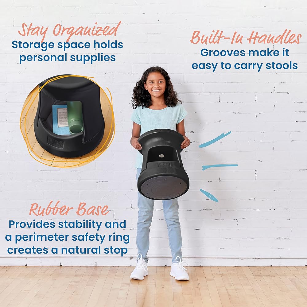 The Storage Stool is a flexible seating option ideal for those who like to wiggle and wobble while they sit. Unlike a standard classroom chair, seats that rock, tilt, and swivel allow freedom of movement and encourage good posture and alertness while learning. Continuous small movements increase blood flow to the body and brain aiding concentration without distracting others nearby. These seats feature a built-in storage space to keep small supplies, reading books, and water bottles within reach. Designed for everyday use in schools, homes or offices, these functional and colorful stools are a fun way to provide extra seating in any learning space. Active seating is ideal for individuals who have restlessness, ADHD, ASD, or sensory sensitivities. The lightweight and adaptable seat is the perfect grab-and-go stool for taking the classroom indoors and out. Quickly and easily rearrange workspaces to create a dynamic collaborative environment between students or use for individual work study. This wobble stool features a latex-free rubberized base that helps keep the seat in place on hard or carpeted surfaces, and a perimeter safety ring that creates a natural stop.